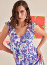A flowy maxi dress, with soft ruffles and asymmetric frills all over featuring a V-neck and a side slit. Length 61”. The model is 5'7" and is wearing a size S.