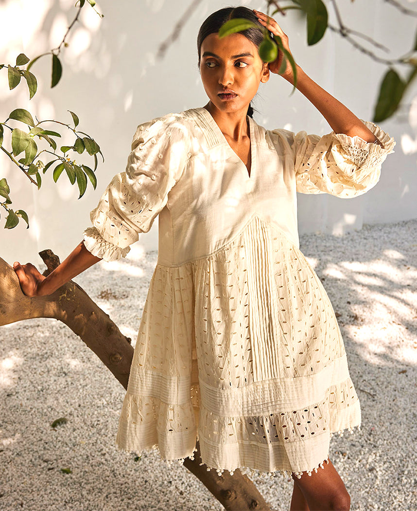 A mini dress with pin tucks details at the neckline, smocking details at the sleeves and lacework along the hemline. Features a V-neck. Length 35". The model is 5'8" and is wearing size S.