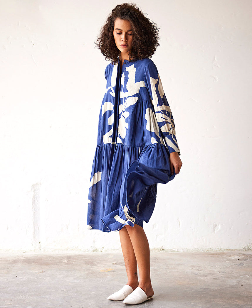A printed tent dress with a drop waist featuring a round neck, a concealed front button placket and flounced hem. Length 44". The model is 5'6" and is wearing size S.