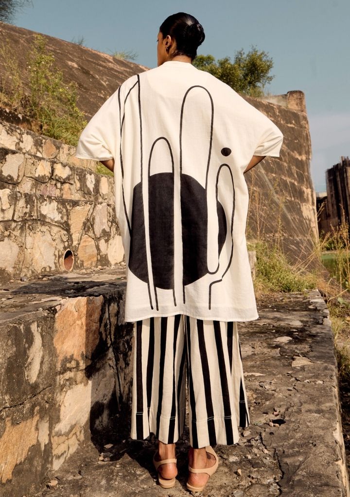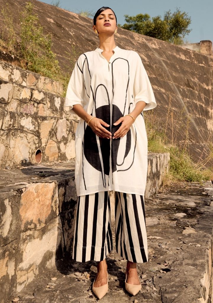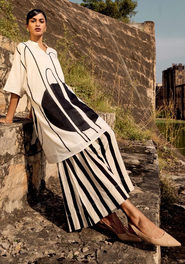 A two-piece set pairing the Dusky Lark Tunic and the Dusky Lark Pants. The Lino printed tunic features a front button opening, a mandarin collar and inseam pockets. Length 37.5". The striped flared culottes features a front button-zip opening and inseam pockets. Length 35.5". The model is 5'9" and is wearing size S.