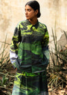 A printed long sleeve shirt featuring a classic collar and a front button placket. Length 27", Sleeve length 22". The model is 5'5" and is wearing size M.