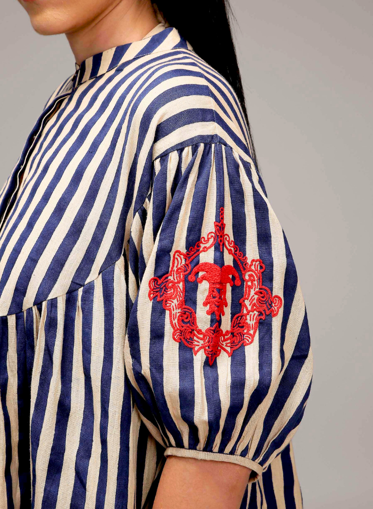A loose, comfortable kaftan-style tunic with hand-block printed stripes and beautifully hand-embroidered sleeves with joker thread work. Features a front button opening and handy side pockets. Length 36".