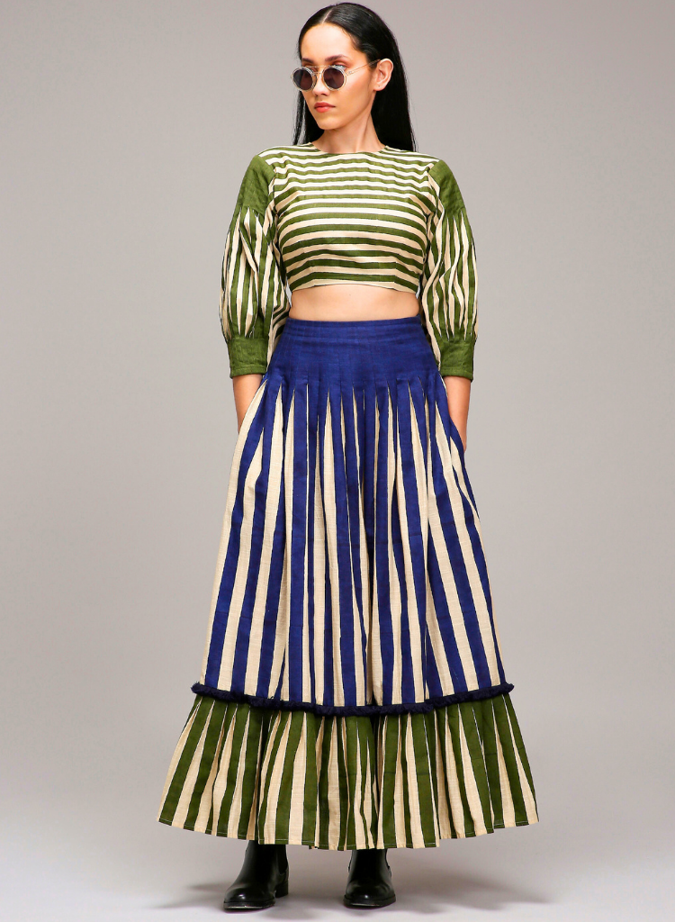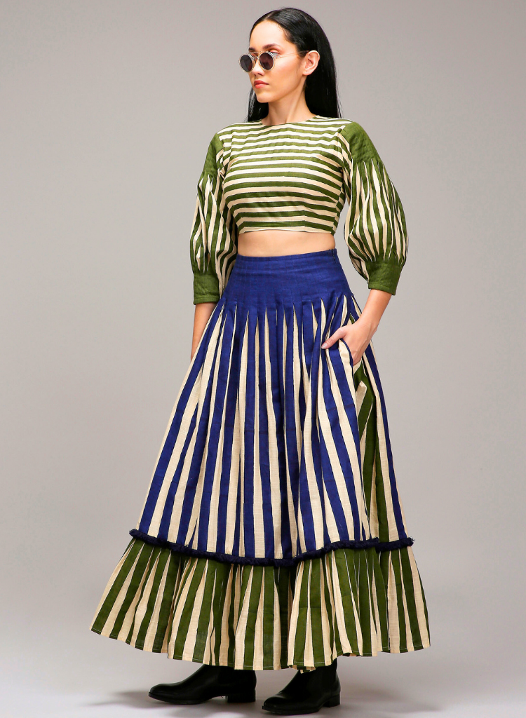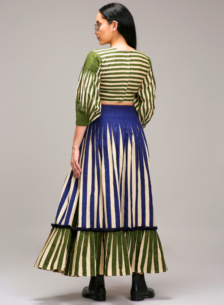 A two-piece set pairing the Dual Striped Skirt and a matching crop top. The dual-striped skirt with hand-blocked stripe patterns and a contrasting pleated side panel features pleated detailing at the waistband, two functional side pockets, and a concealed zipper offering both style and comfort. The fringed lace trim on the lower half adds a unique textural accent. Length 40". The crop top features pleated detailing at the upper and lower sleeves, along with elasticated hems for added shape and style. Length 15.5".
