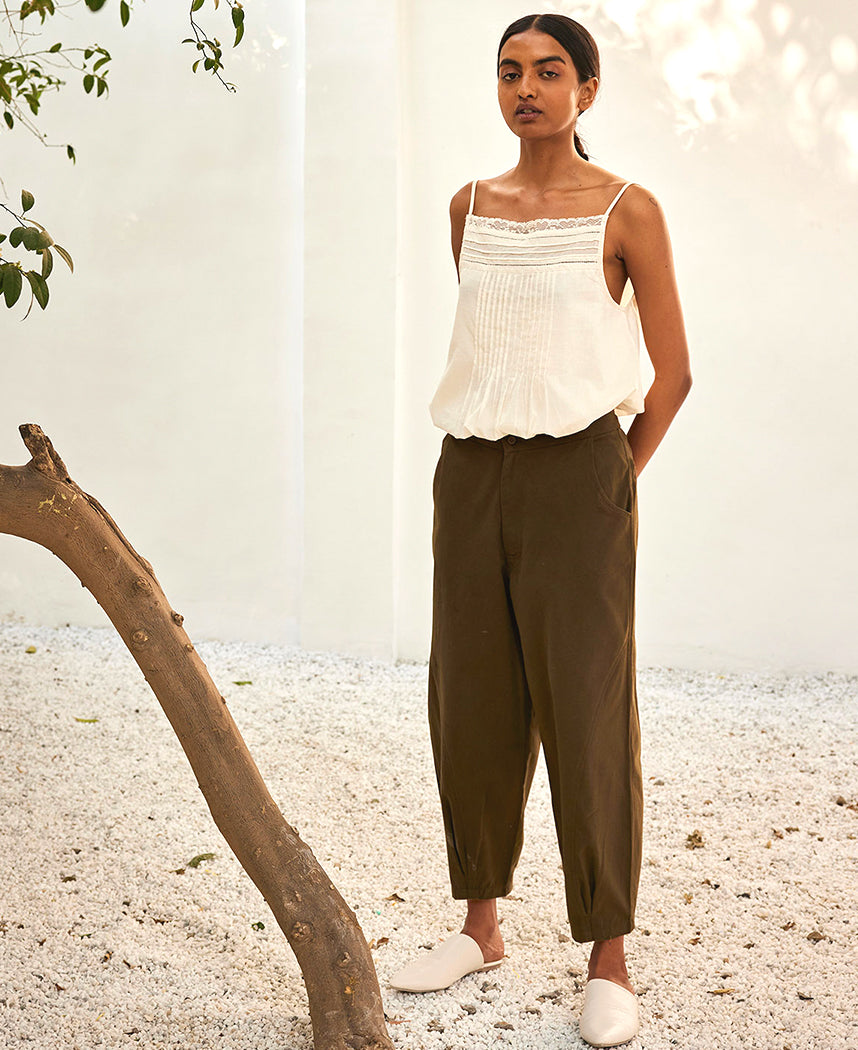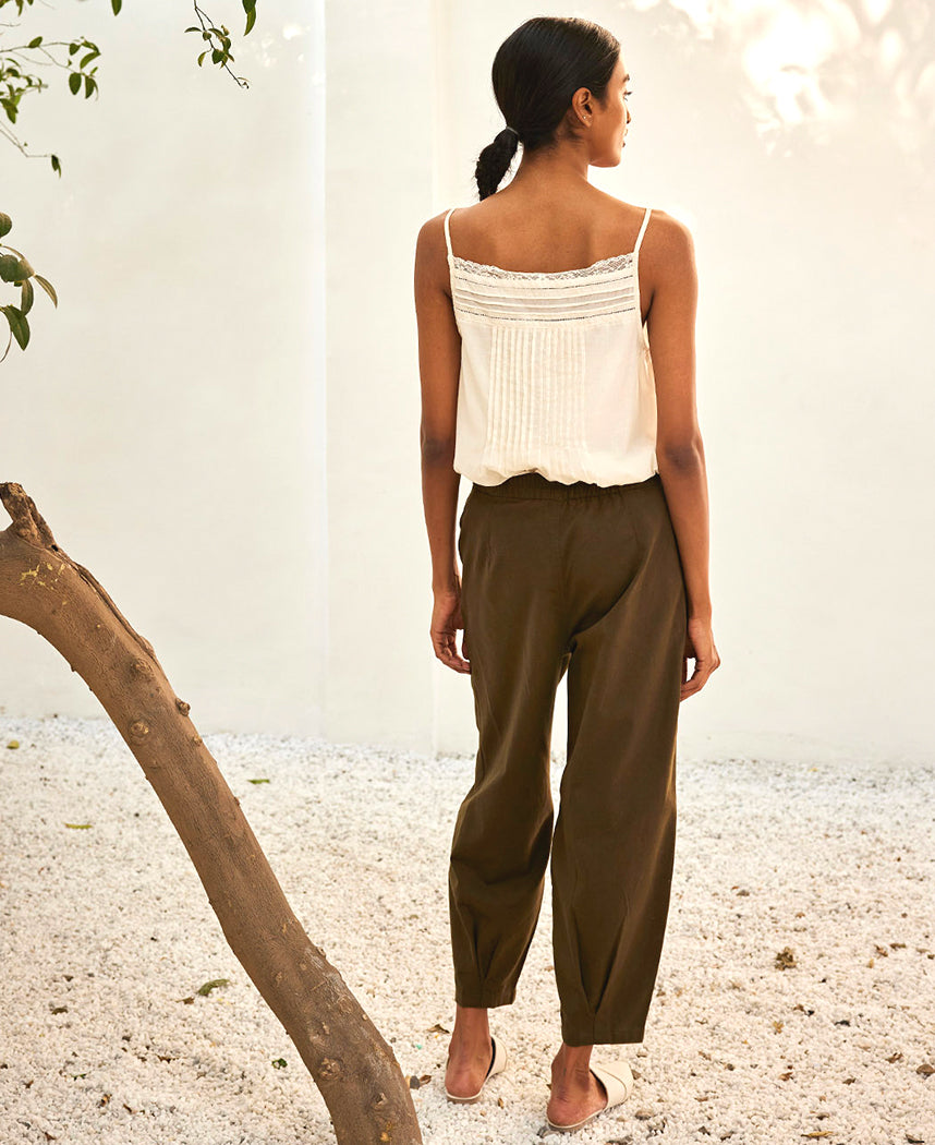 A camisole top with pin tucks, lace and stitch embroidery detailing featuring a square neck. Length 25". The model is 5'8" and is wearing size S.