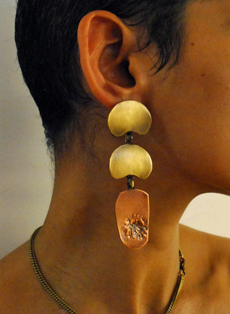 A pair of drop earrings with irregular oxidised brass plates. Size 3cm x 6.5cm.