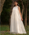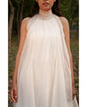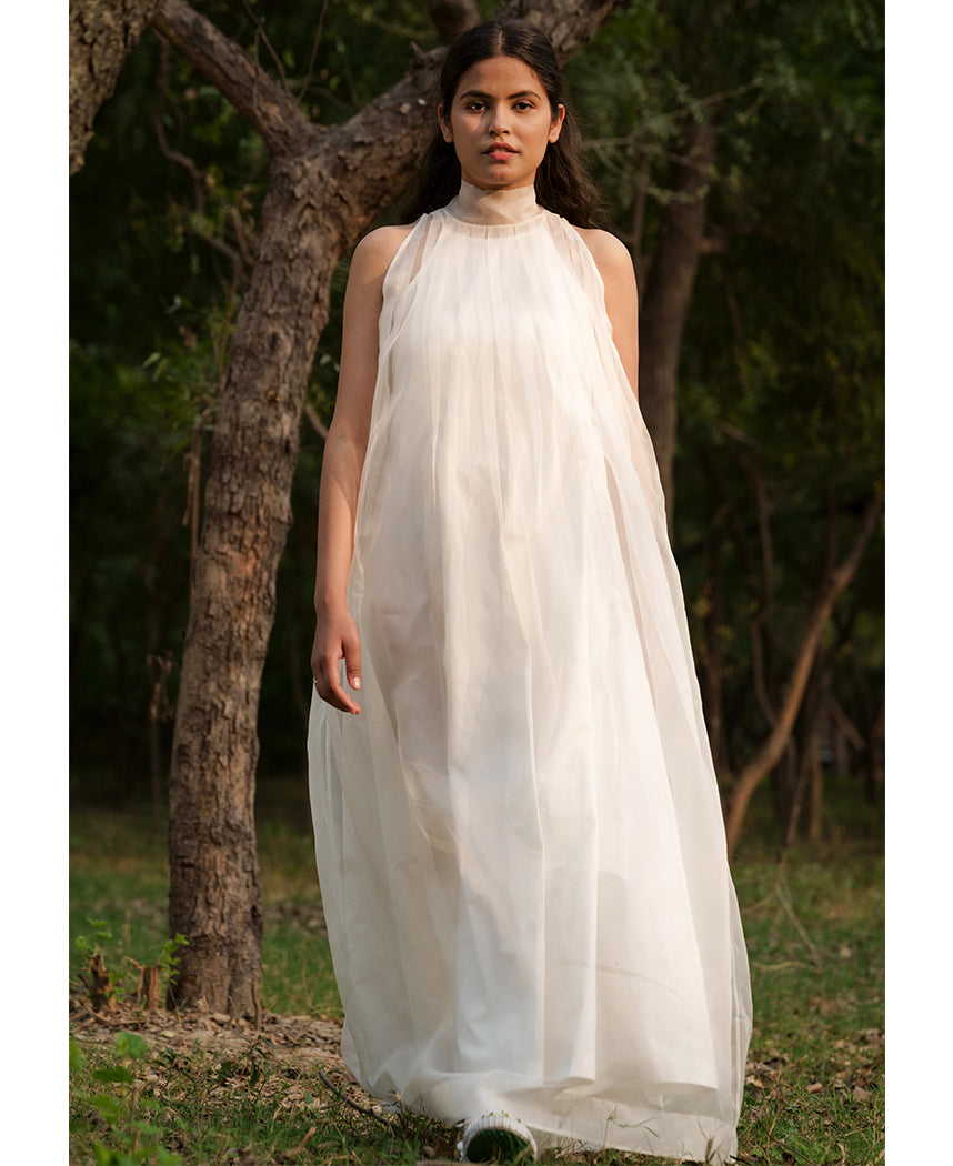 A floaty sheer halter style dress with a high collar and pleat details. Features a bow tie-up at the back and comes with a cotton slip. Length 54". The model is wearing a size M.