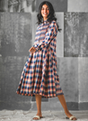 An A-line checkered midi dress with pin-tucked yoke, half button-down placket with crochet buttons, and gathered waist. Features a stand collar, long cuffed sleeves, and side pockets. Length 42.5". The model is 5'3" and is wearing size S.