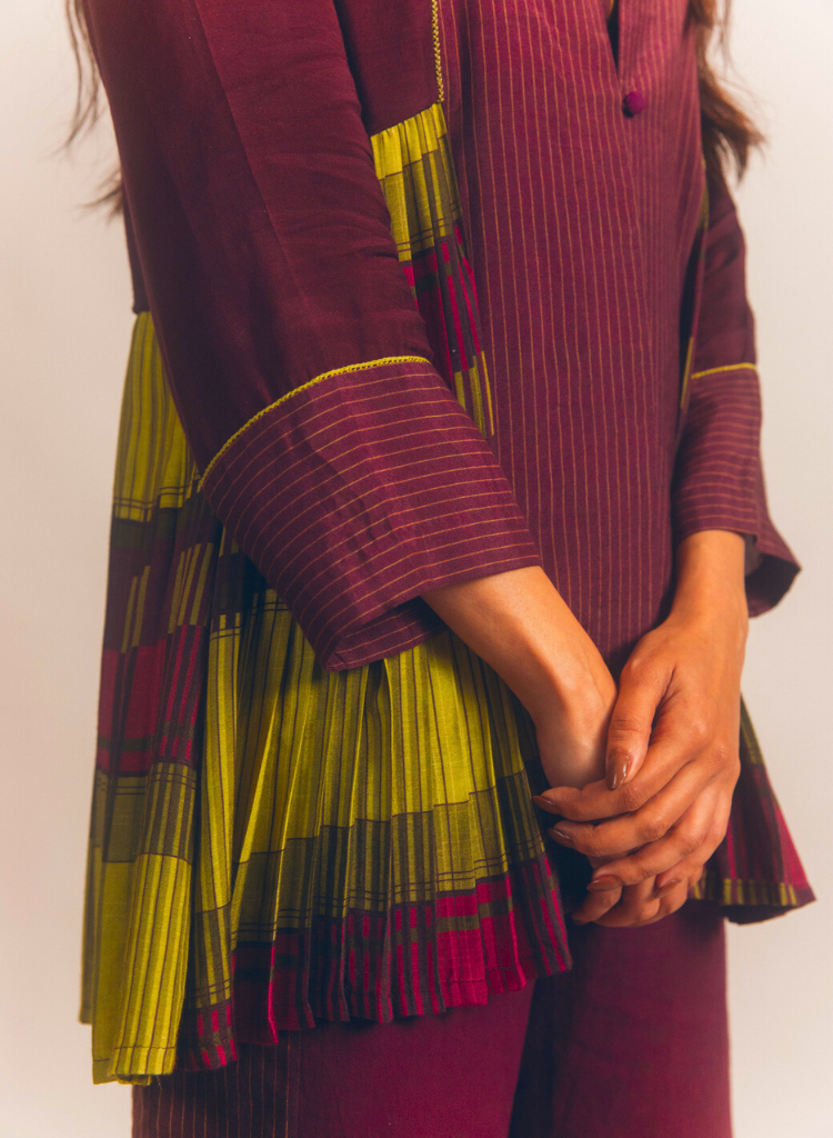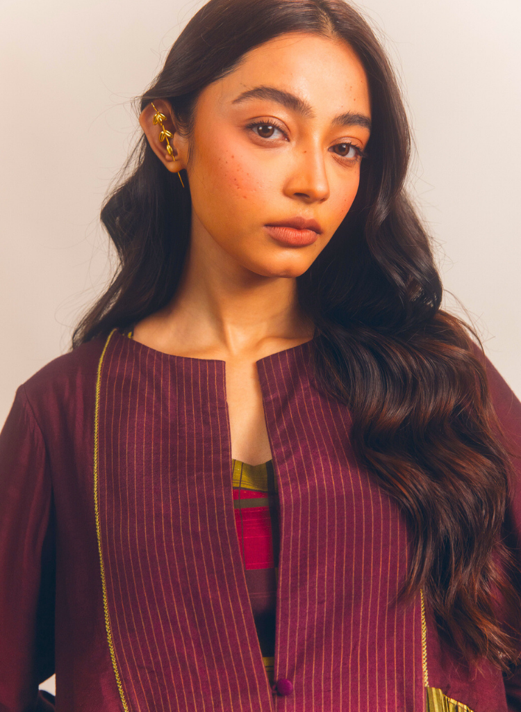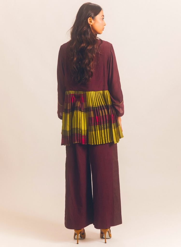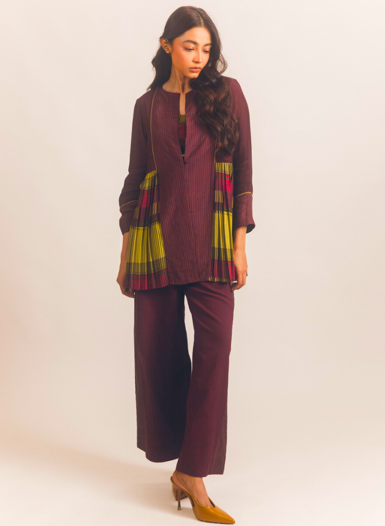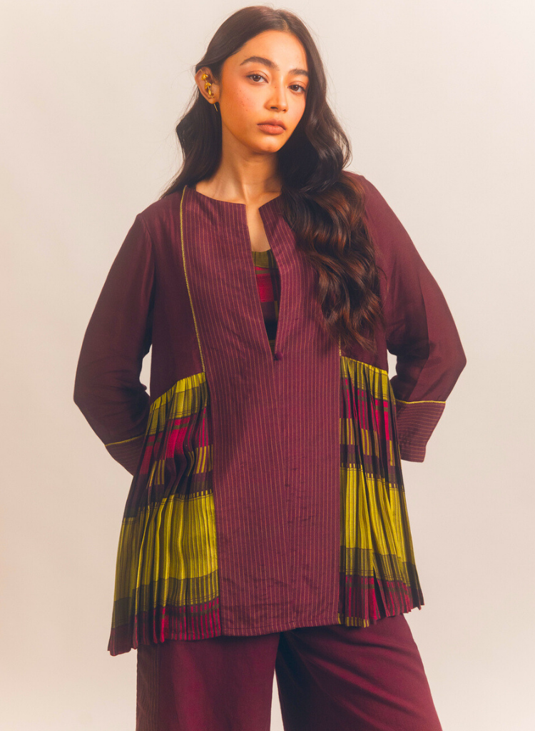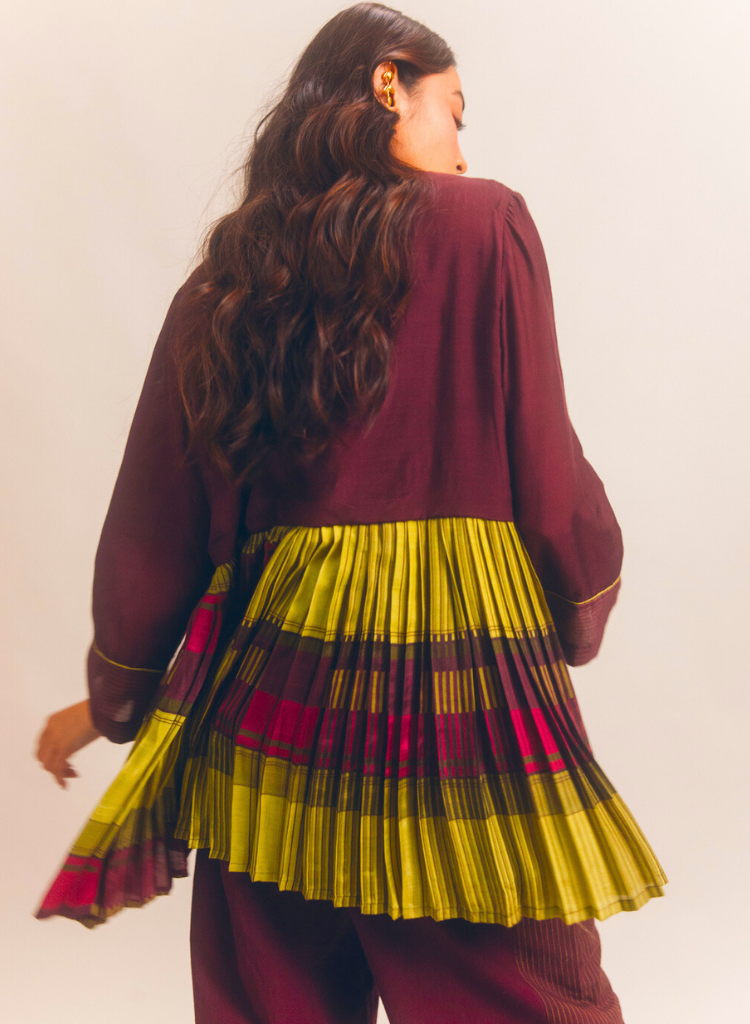 A panelled jacket with pleat details featuring a round neck with a slit. Comes with a printed slip. Length 28". The model is 5'7" and is wearing a size S.