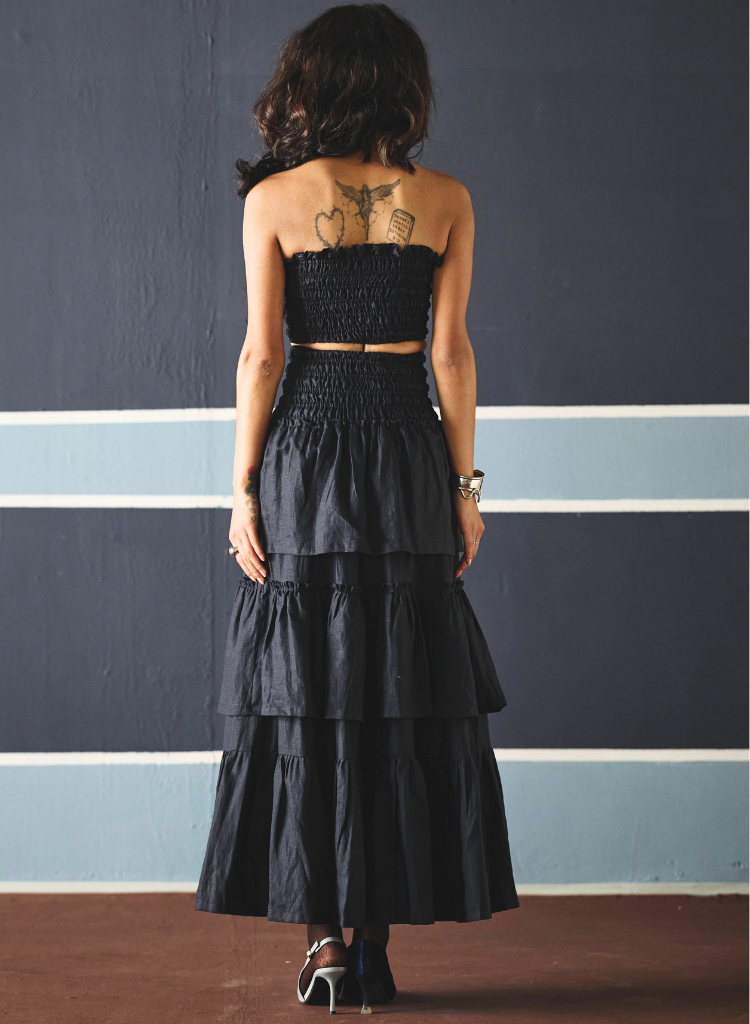 A maxi flowy skirt featuring a smocked elasticated waist. Length 40". The model is 5'9” and is wearing size S.