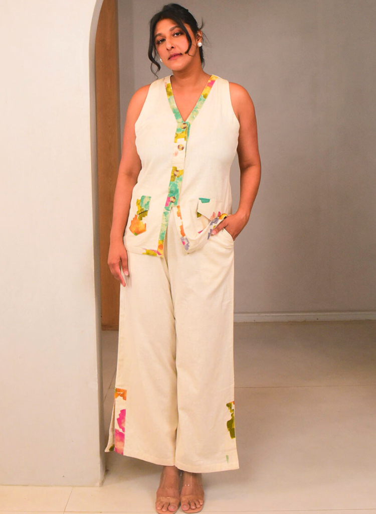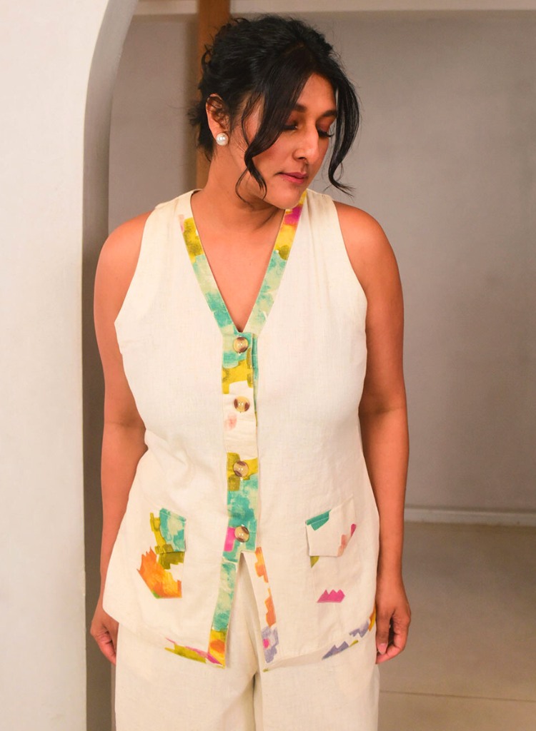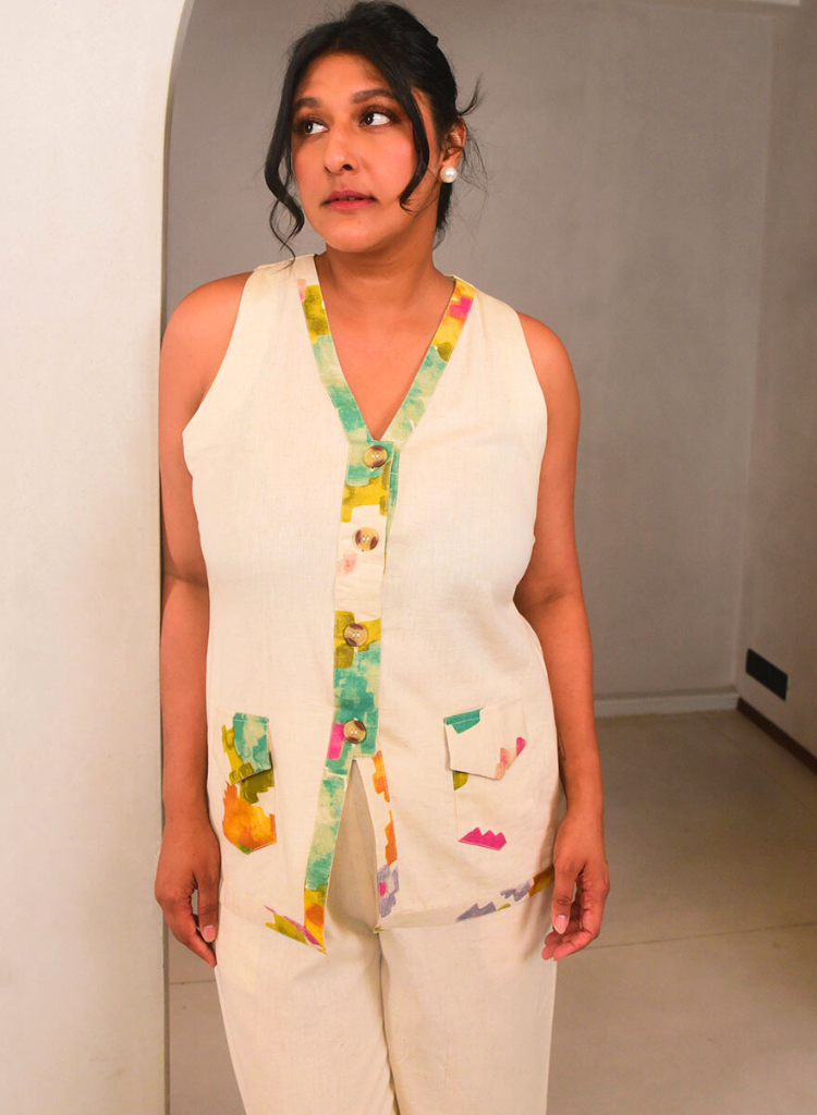 A classic vest with printed floral panels along the neckline and hem, featuring a button open front and pockets. Length 27". The model is 5'6" and is wearing size L.