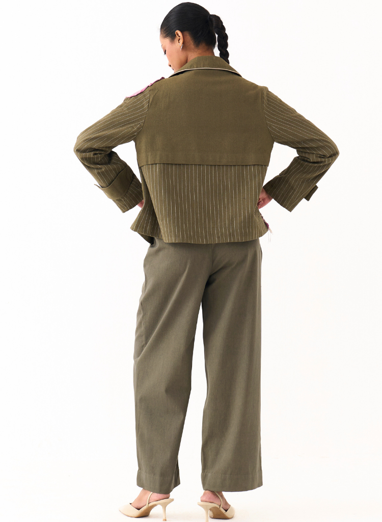 A relaxed fitting striped jacket with a floral patch work featuring a lapel collar. Length 23.5". The model is 5'7" & is wearing size S.