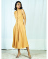 A fit and flare dress with embroidered buttons. Has a closed round neck and inseam pockets. Length 48".