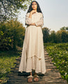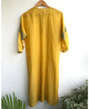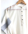 A breezy side slit tunic with hand-embroidered details at the sleeves. Features a closed round neck and front button placket. Length 39". Made in 100% cotton Chanderi. The product displayed is a size S.
