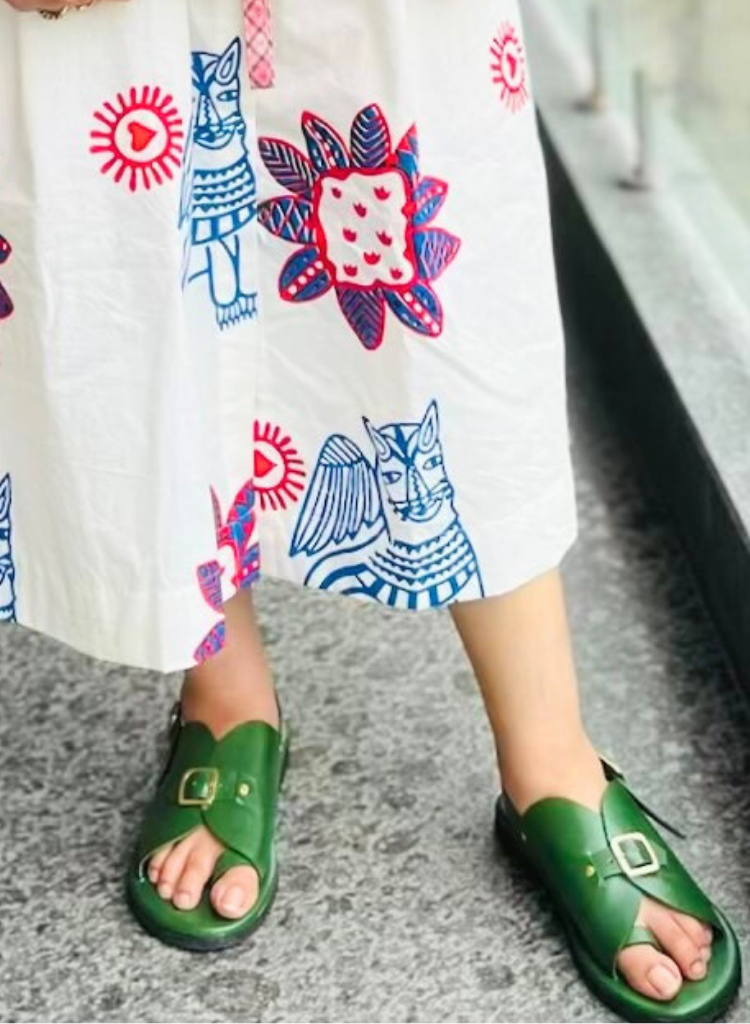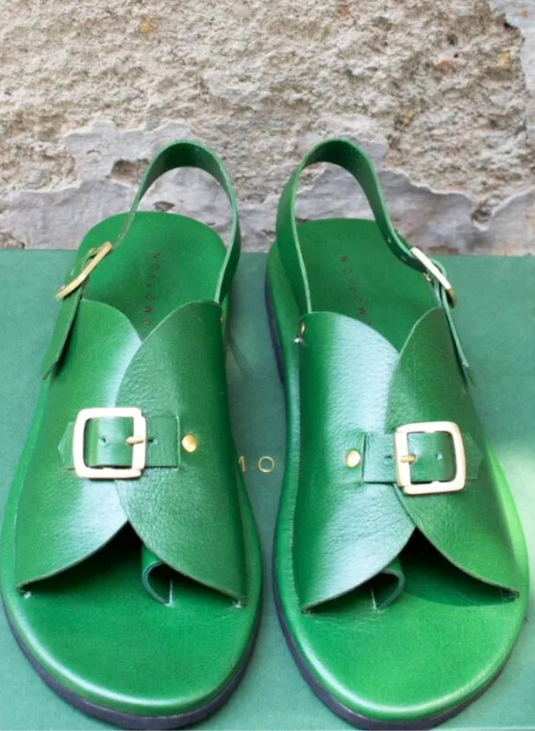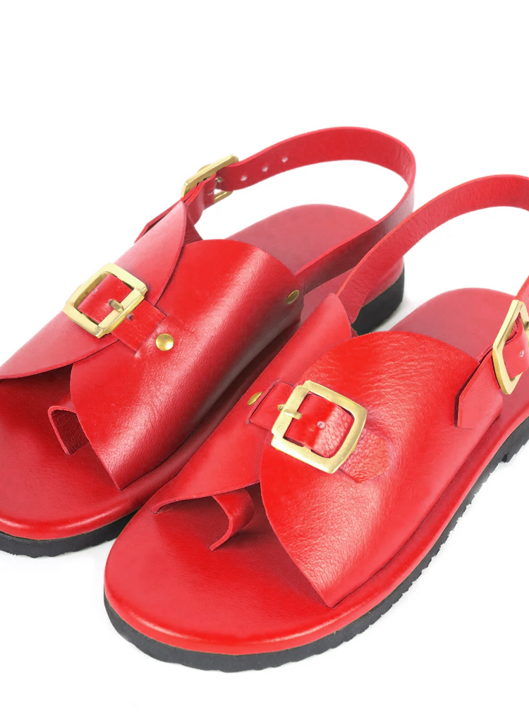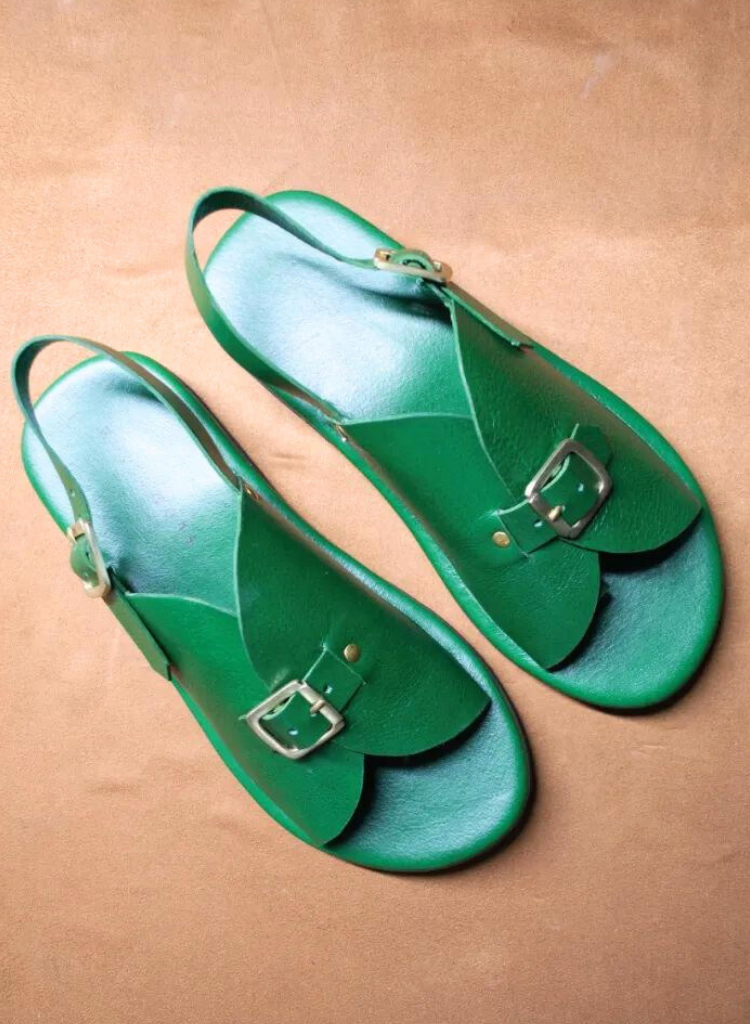 This style features an over-foot broad band overlapping with brass buckle detail on the top and an adjustable back strap that grips your foot firmly.