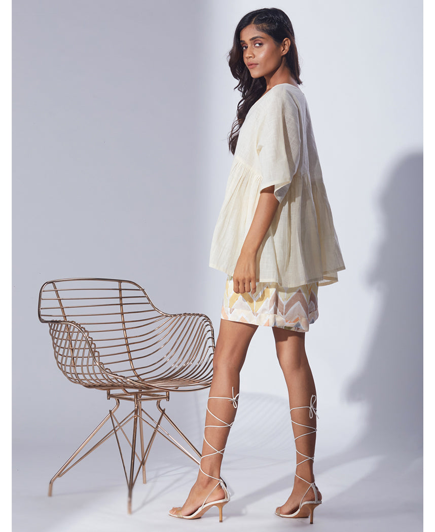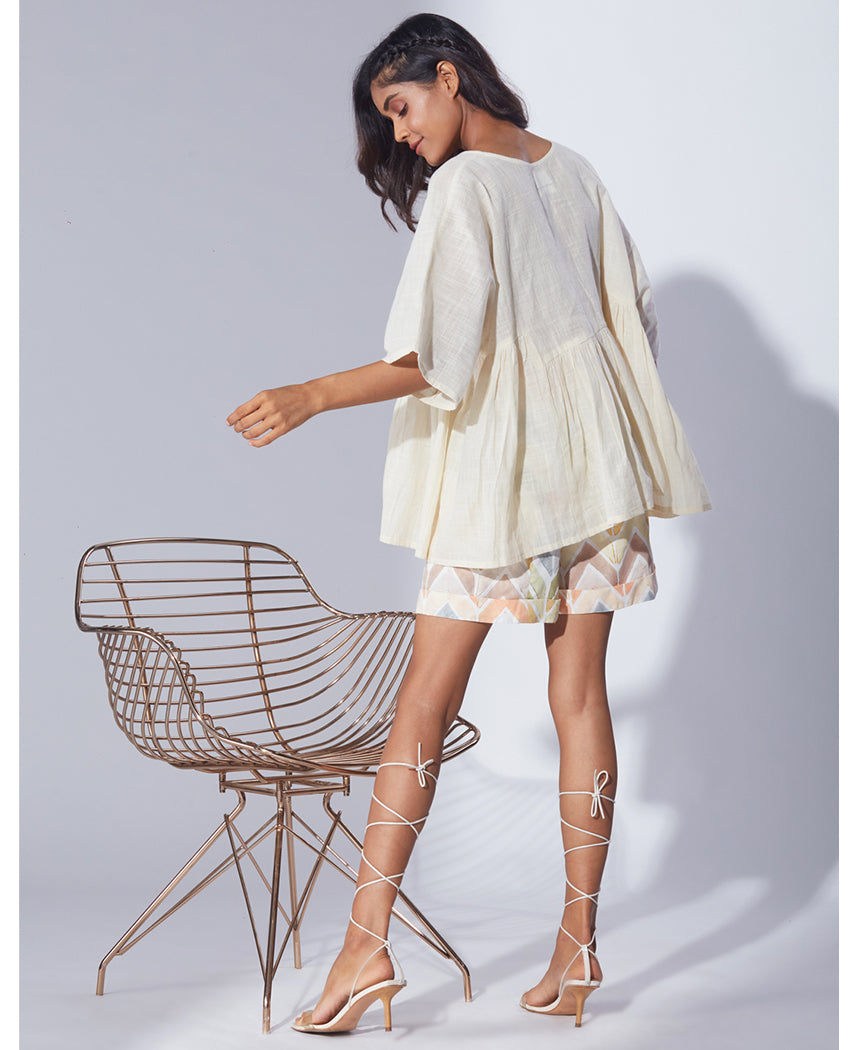 A pair of relaxed-fitting shorts with hand-block print. Features inseam pockets. Length 18”. The model is 5'7" and is wearing a size XS.