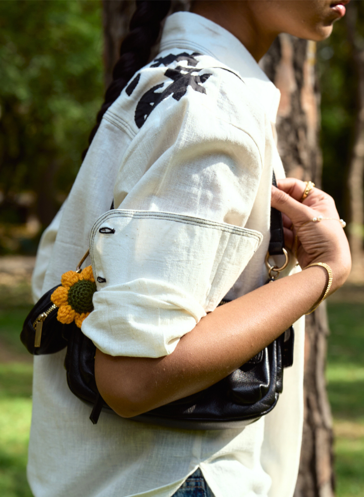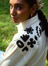 A relaxed fitting long sleeve shirt with appliqué details featuring a front placket with brass buttons, cuffed sleeves and a curved hem. The model is 5'9" and is wearing a size S.