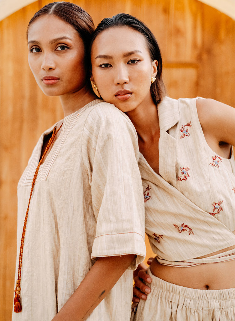 A two piece set pairing the Estella Vest and Estella Shorts. The cropped vest with intricate hand embroidered fish motifs and highlighted with stitching detail on tieable straps features a lapel collar and a tie-up detail. Length 17". The matching wide legged shorts feature a high rise elasticated waist and side inseam pockets. Length 16.5". The model is 5'8", and is wearing size S.