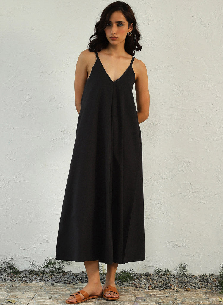 Classic and chic, this maxi dress is a piece you'll find yourself reaching for time and time again. Features slender shoulder straps, a V-neckline and deep pleats that create a sense of volume and movement. Length 50". The model is 5'9" and is wearing size S.