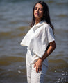 A boxy crop top with a collared V-neck and drop shoulders. Length 16.25-17.75" based on size. The model is 5'3" and is wearing size XS-S. Made in 100% organic hand spun cotton. Unlined and slightly sheer.