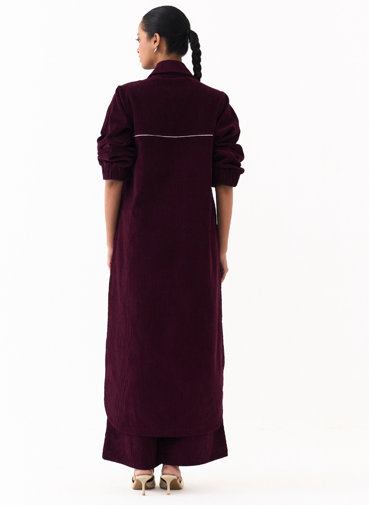 A long tunic with high side slits and contrast piping detail at the placket and yoke featuring patch pocket detail and elasticated sleeve hem. Length 48". The model is 5'7" & is wearing size S.