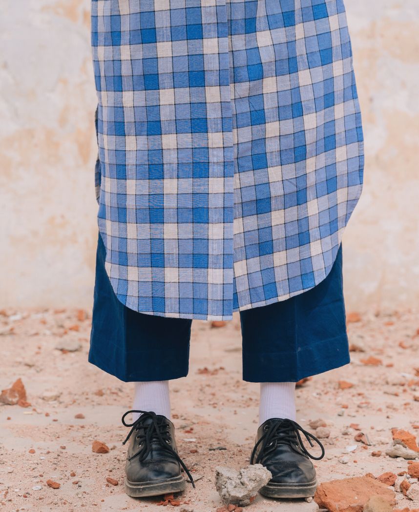A checkered midi dress with a curved hem featuring a pointed collar, a concealed front button placket, and inseam pockets. Length 44". The model is 5'6" and is wearing a size S.