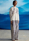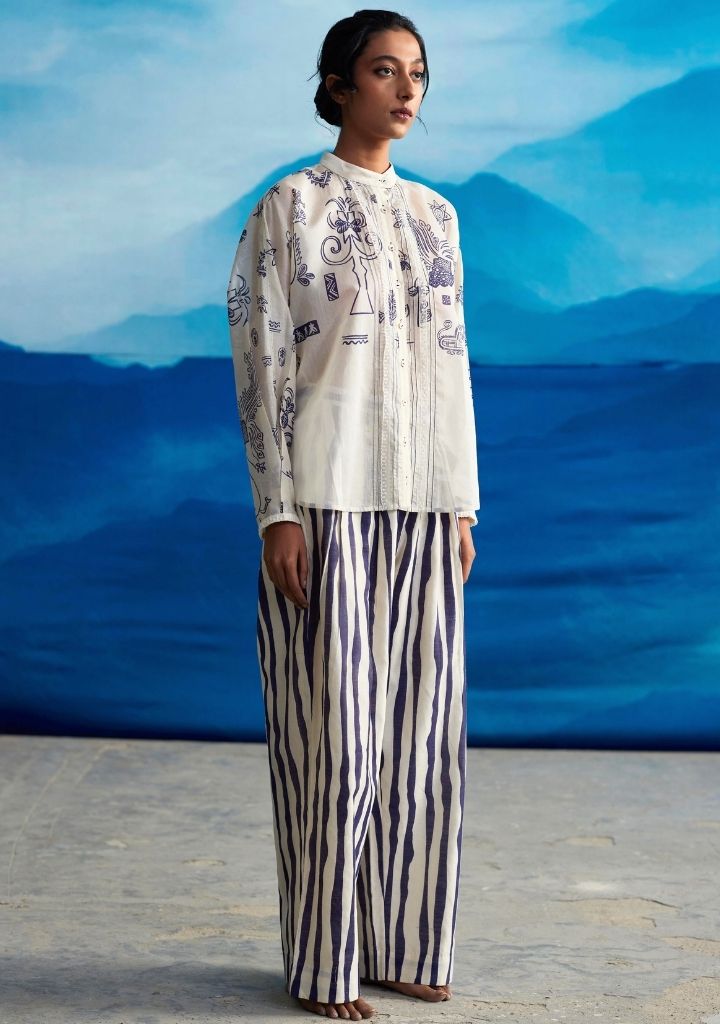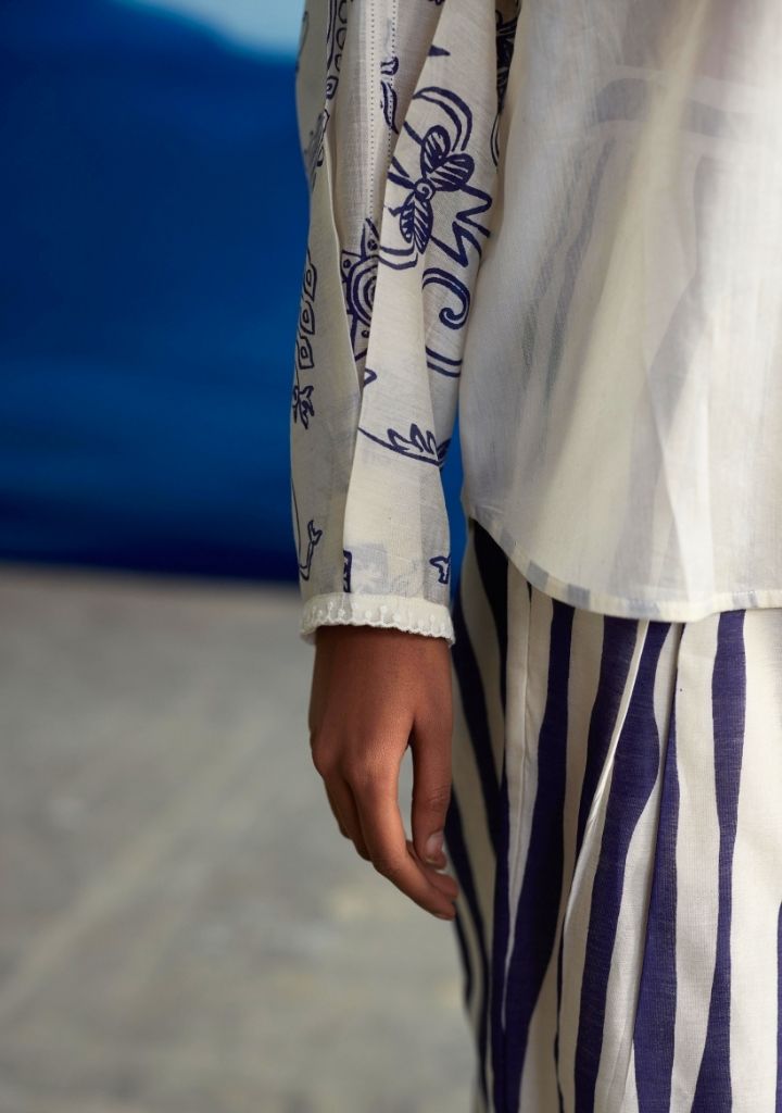 A hand-screen printed boxy semi-sheer top with pintuck and lace details. Features a band collar and long sleeves with laced hem. Length 26". The model is 5'8" and is wearing a size M.
