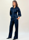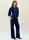 A pair of pants featuring a flared bottom, a contrast top stitching and inseam pockets. Length 43". The model is 5'8" and is wearing size S.