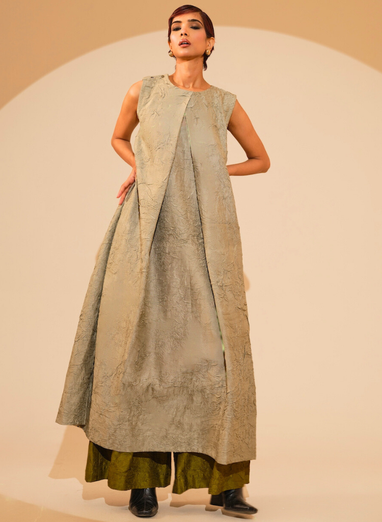 A two-piece set pairing the Flip Tunic and the Root Pants. The relaxed, easy-to-wear long tunic features an abstract drape and overlapping pleats, creating a subtle three-dimensional form. Length 52". The crushed pants features an elasticated waist and inseam pockets. Length 40".