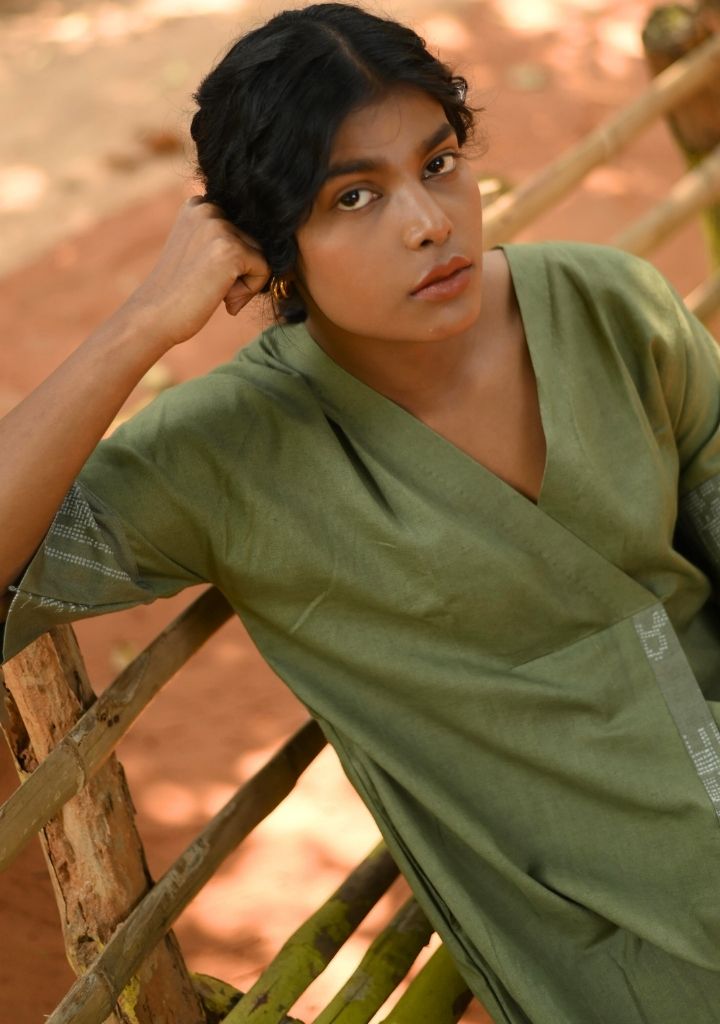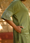 A midi kaftan-style dress with an overlapping neckline, a pleated back with hand-printed motifs, and side slits with a rounded hem featuring kimono-style 3/4 sleeves and a V-neckline. Length 46". The model is 5'3" and is wearing size M.