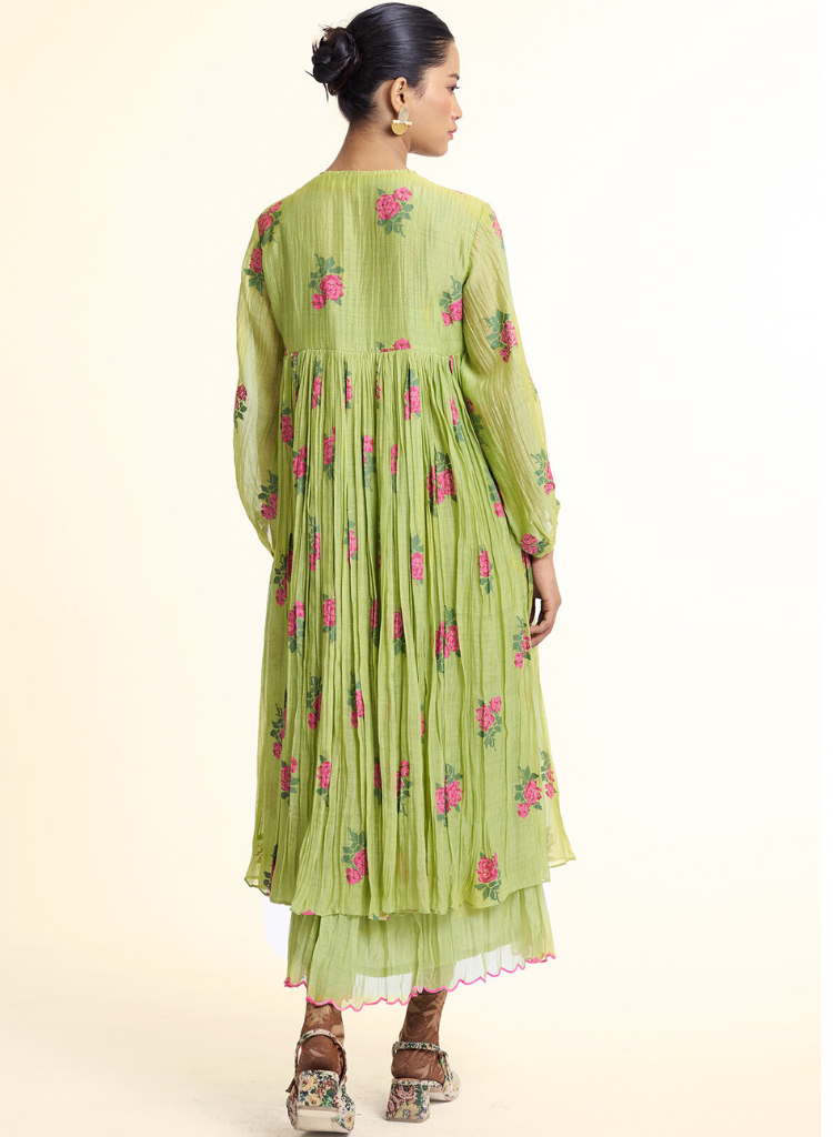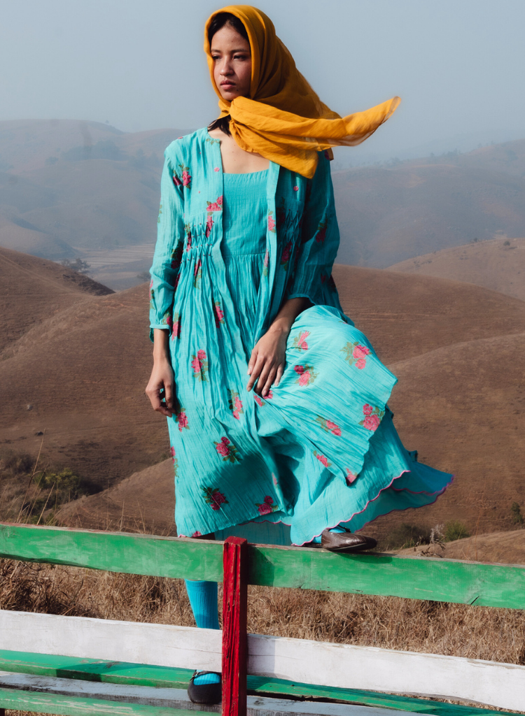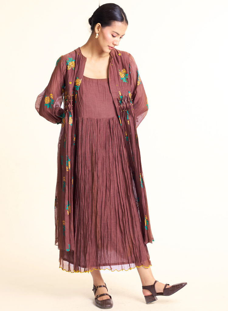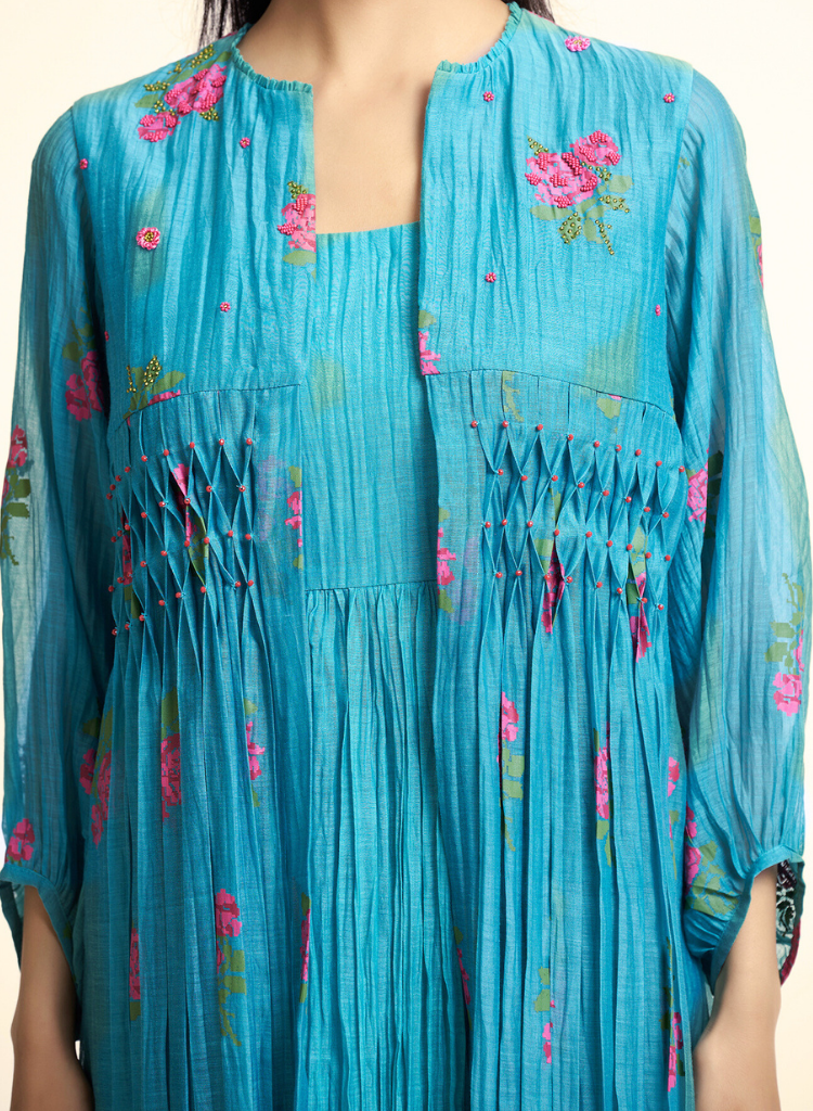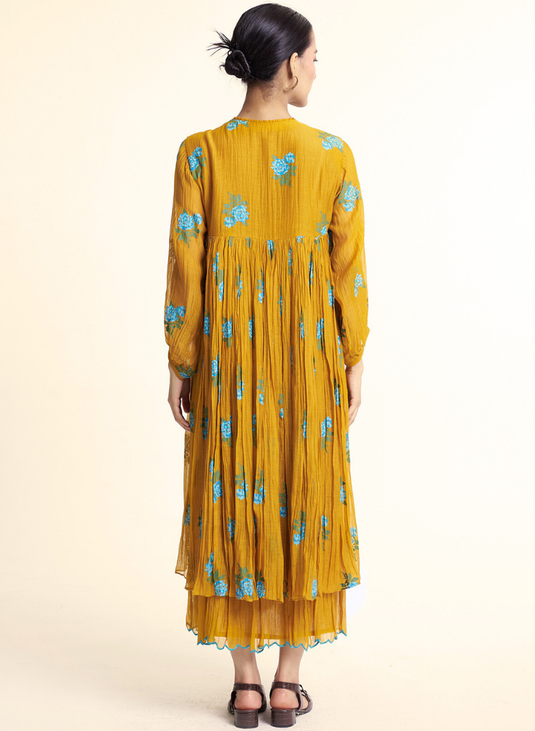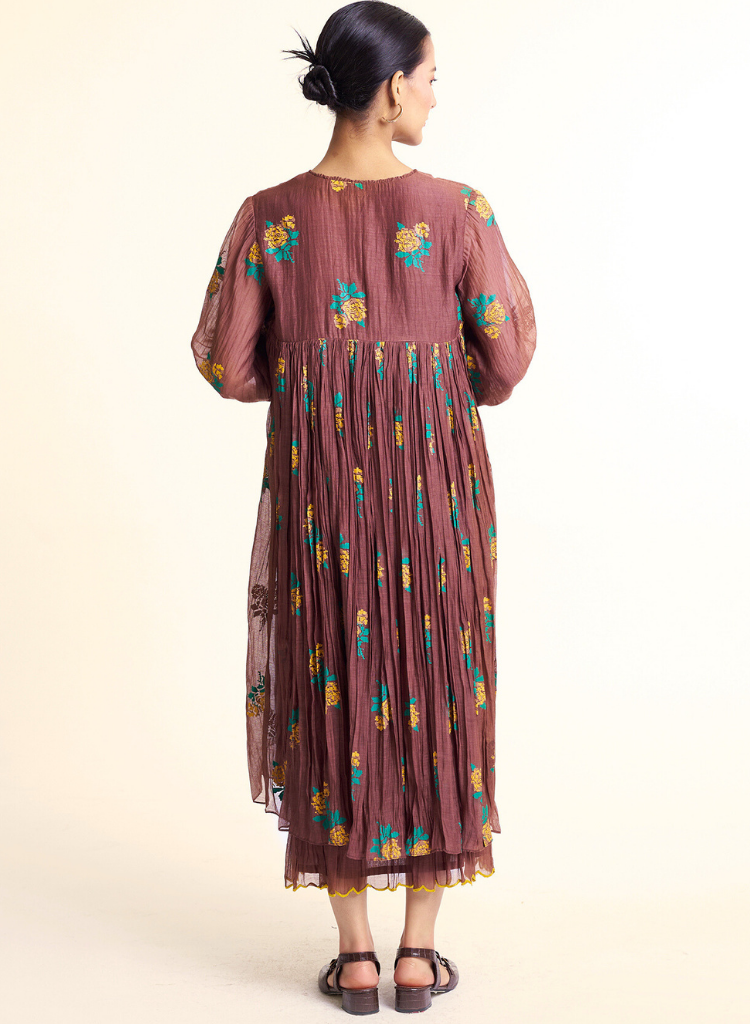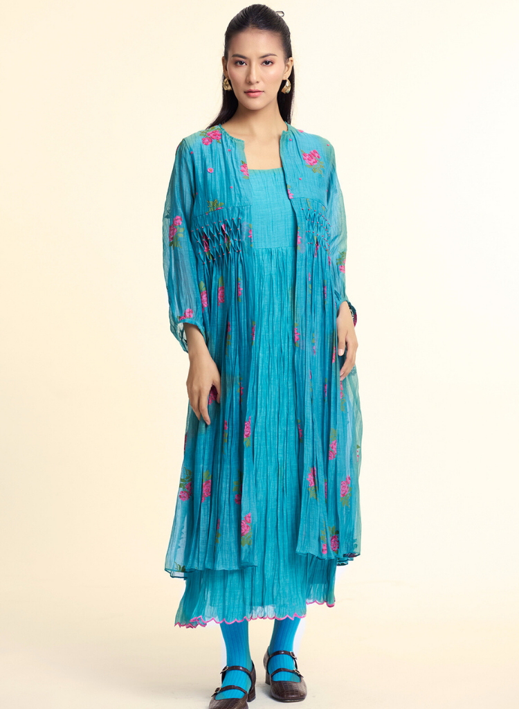 A two-piece set pairing a floral overlay and a spaghetti dress. The floral printed overlay with bead and thread embroidery features light ruffle details at neckline and long sleeves. Length 44". The spaghetti strap dress features light gather at the waist and a scallop hem. Length 48". The model is 5'7" and is wearing a size S.