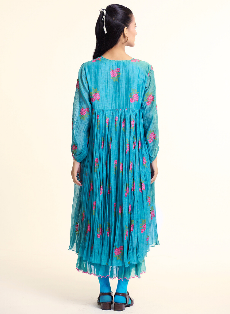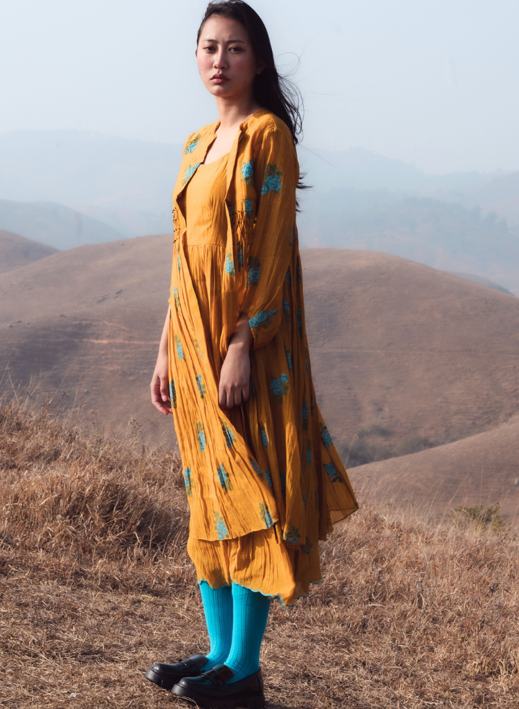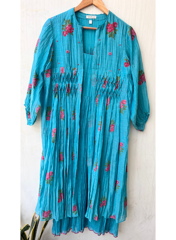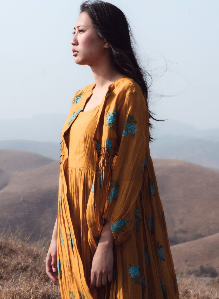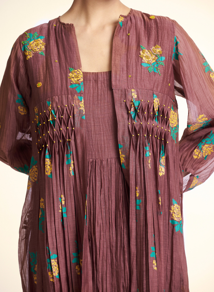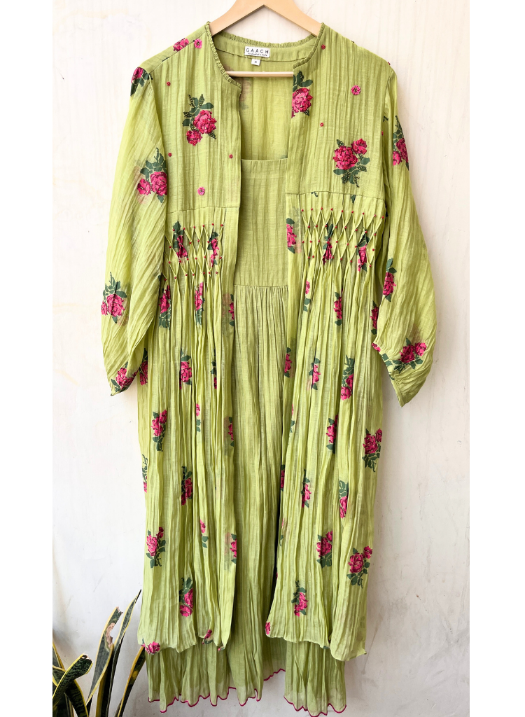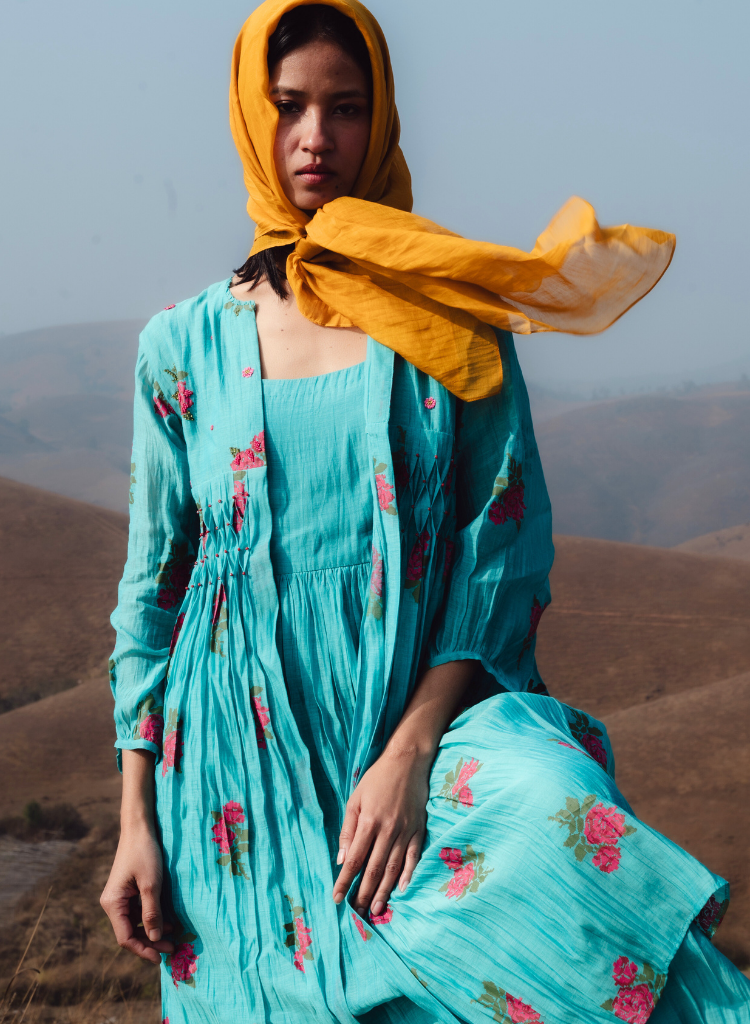 A two-piece set pairing a floral overlay and a spaghetti dress. The floral printed overlay with bead and thread embroidery features light ruffle details at neckline and long sleeves. Length 44". The spaghetti strap dress features light gather at the waist and a scallop hem. Length 48". The model is 5'7" and is wearing a size S.