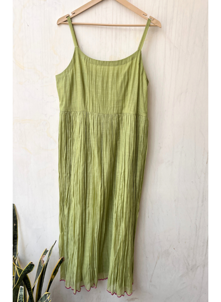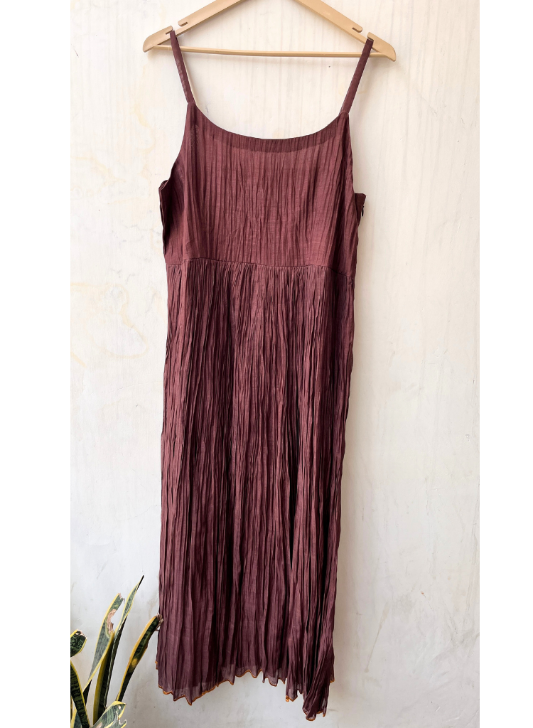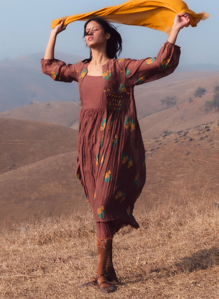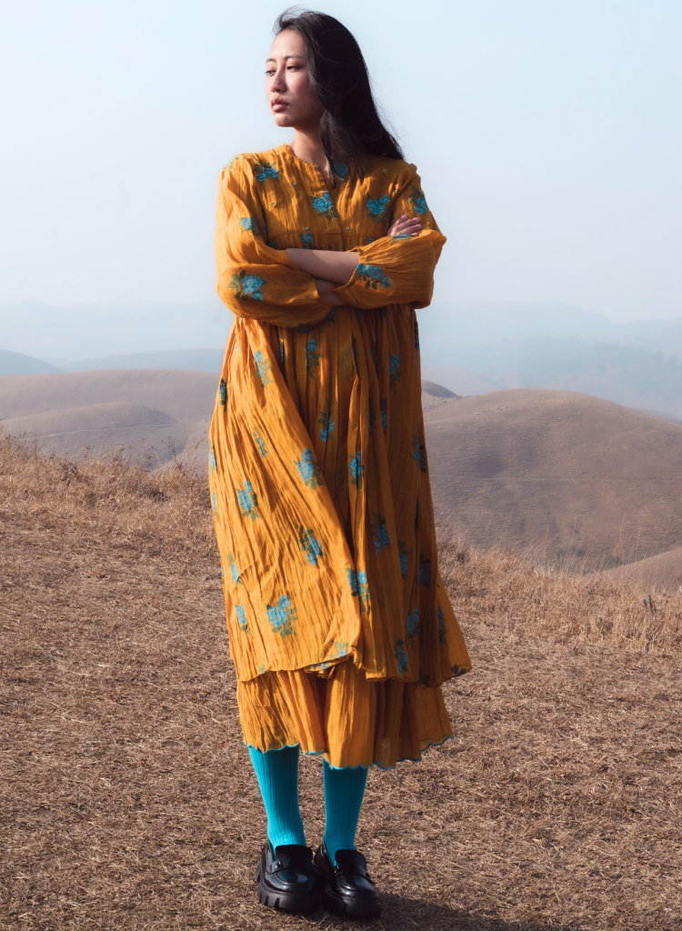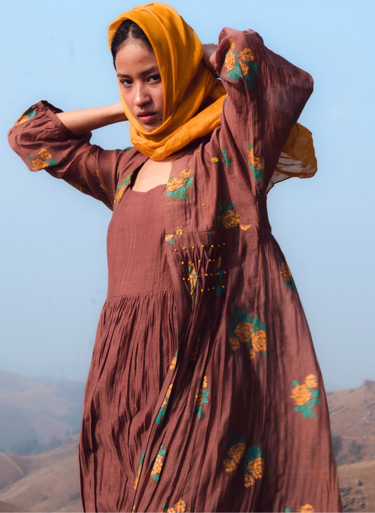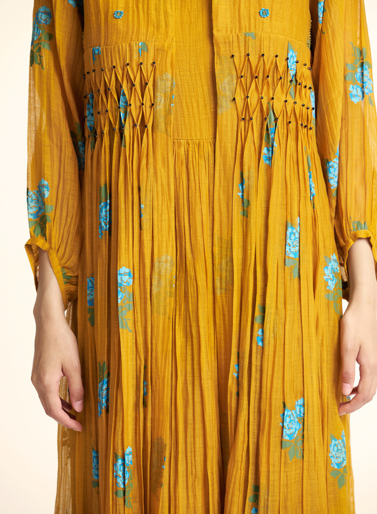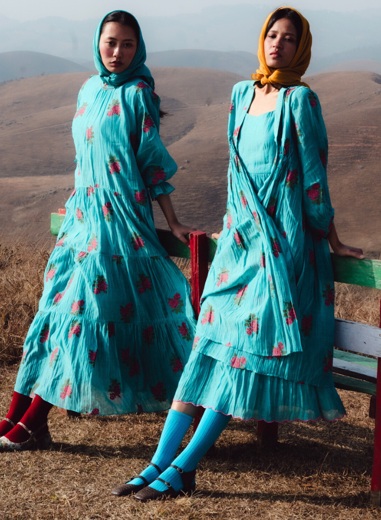 A two-piece set pairing a floral overlay and a spaghetti dress. The floral printed overlay with bead and thread embroidery features light ruffle details at neckline and long sleeves. Length 44". The spaghetti strap dress features light gather at the waist and a scallop hem. Length 48". The model is 5'7" and is wearing a size S.