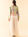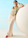 A two piece set pairing the Floral Dream V Lounge Shirt and the Ivory Flared Lounge Pants. The floral printed top with front button-down fastening, stylized hem and a cut-out detail at the back features a plunging V-neckline and long, flared hem sleeves. Length 24". The solid pants with a flattering flared at the hem features a thin elasticated waistband. Length 39". Model is 5'8" and is wearing a size S.