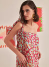 A floral halter-neck draped dress featuring an embellished flower detailing on the neck tie and a front slit. Front length 32", Back length 55". The model is 5'7" and is wearing a size S.