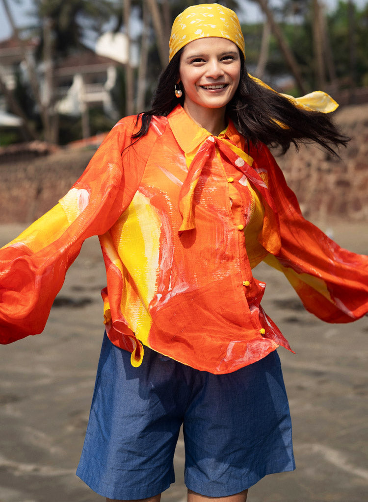 A printed square scarf that can be styled as a head scarf, neck tie etc. Made in cotton silk.