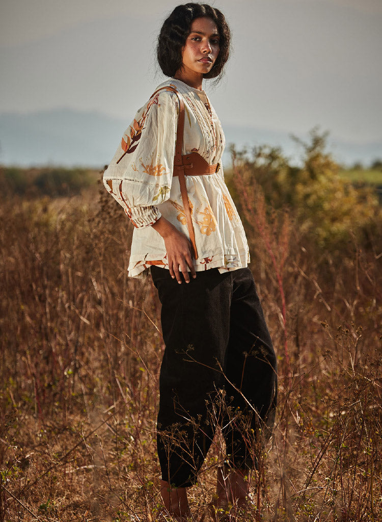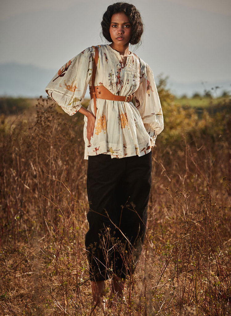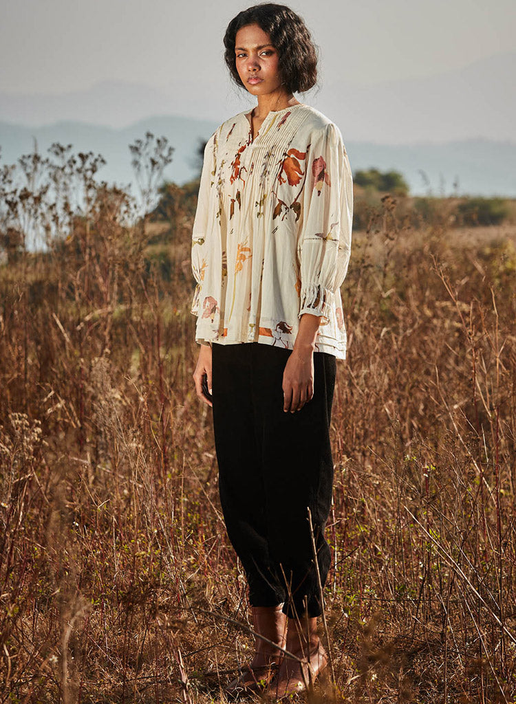 An off-white top with a delicate floral print that evokes the image of flowers scattered across snow. It features pin tuck detailing on the front, back and sleeves, adding subtle texture and elegance. Length 24.5". The model is 5'8" and is wearing a size S.