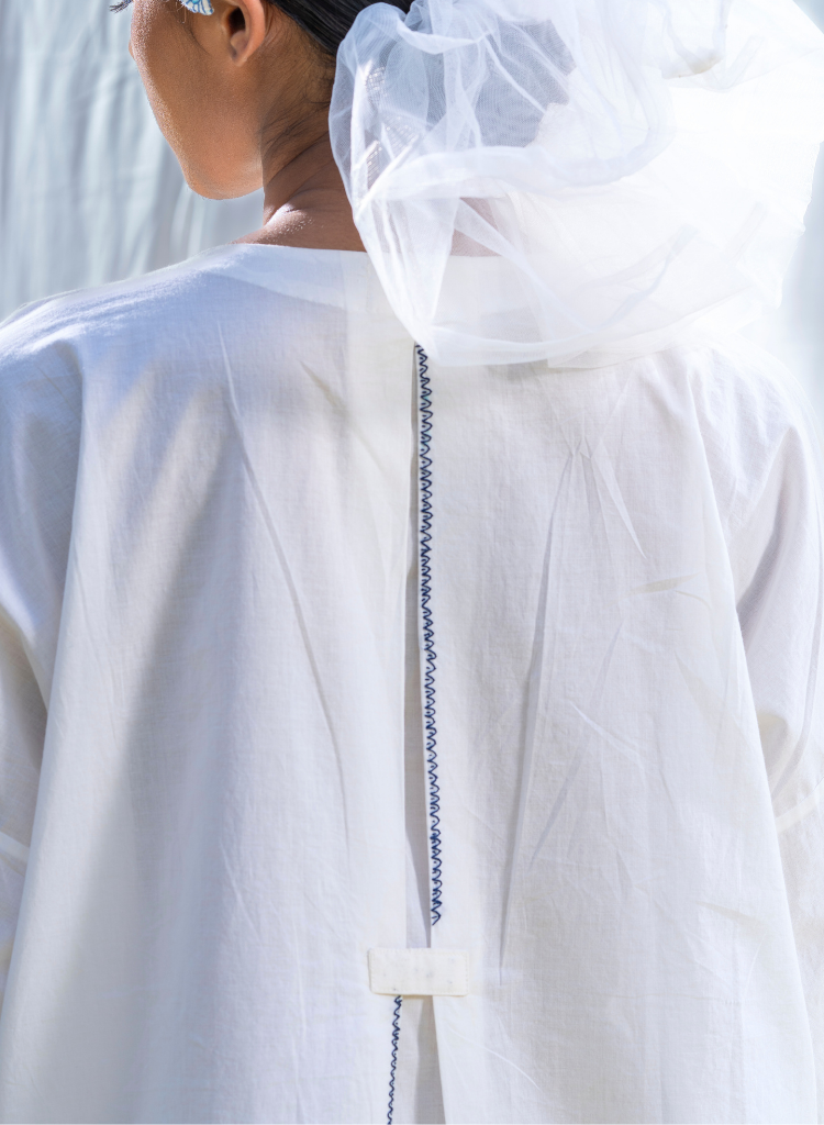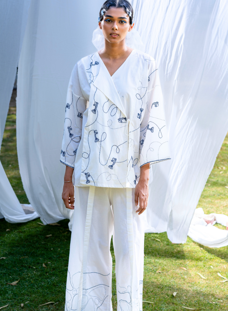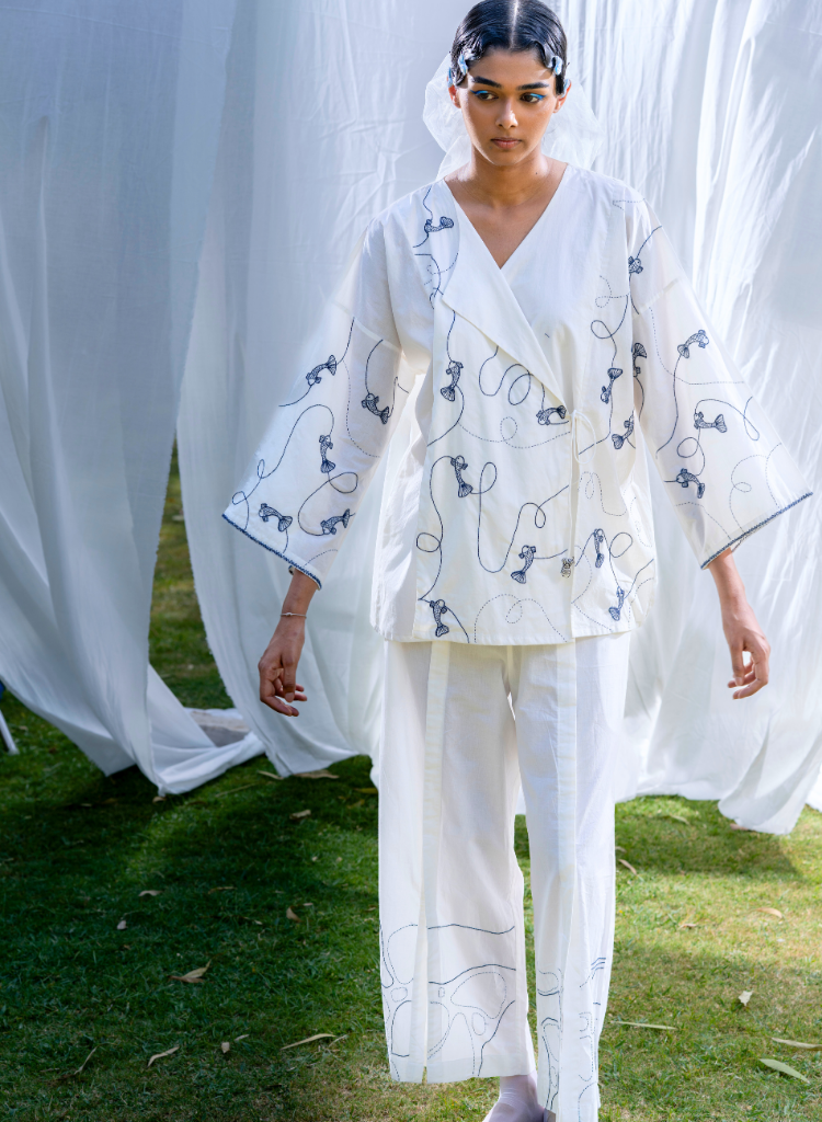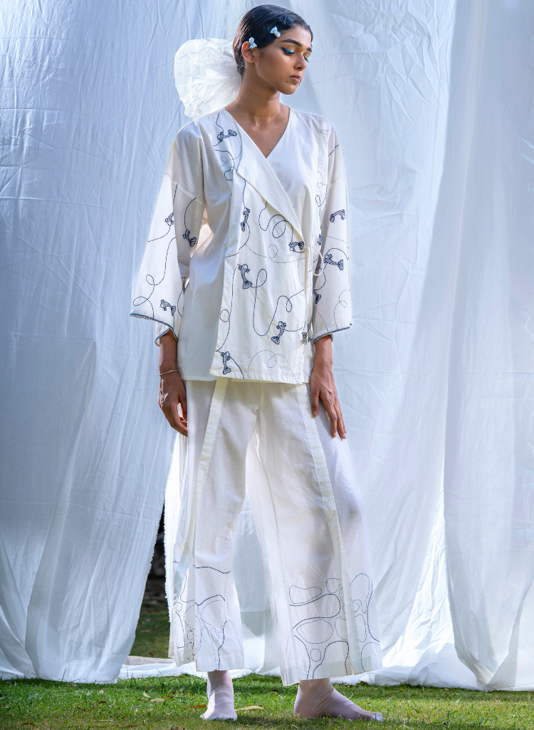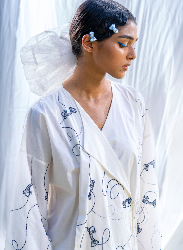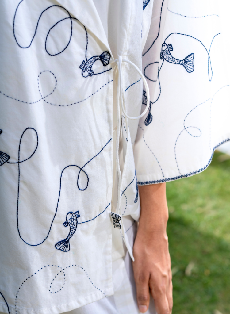 A relaxed fitting open jacket featuring a flap collar for a sharp, structured neckline. The slits in the front panels add movement and ease. An inverted box pleat at the center back provides ease. Fish are embroidered along the panels in multi-directions, adding ocean-inspired detail. Fish tassels add lively detail to the cords. The fish motif is embroidered using stem stitch, and the flowing lines are done with running stitch and stem stitch. Length 28", Bust 50", Hips 52". The model is 5'11" and is wearing a free size.