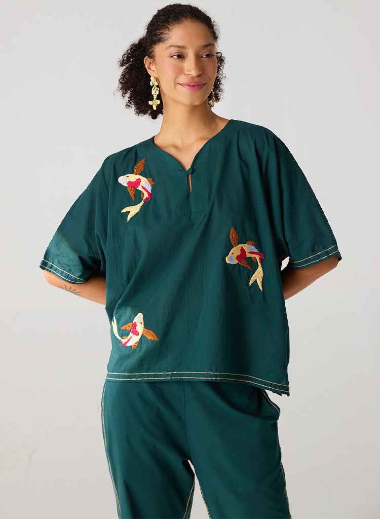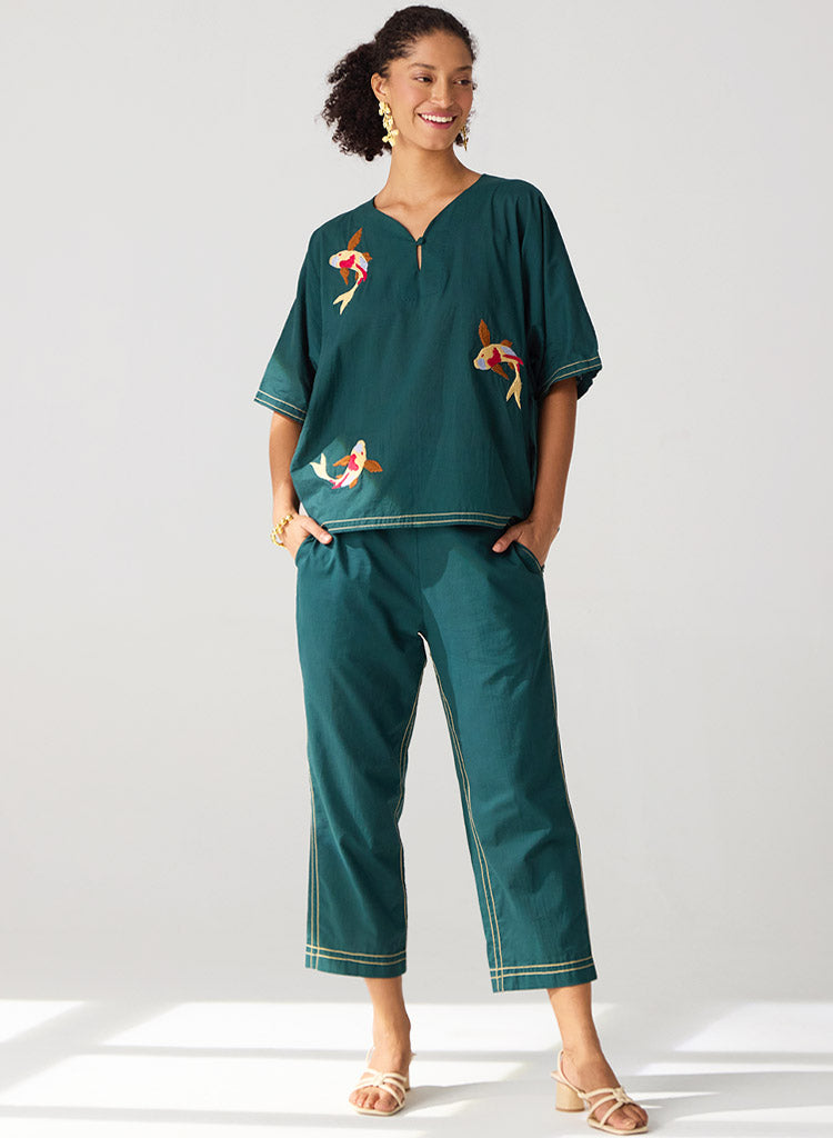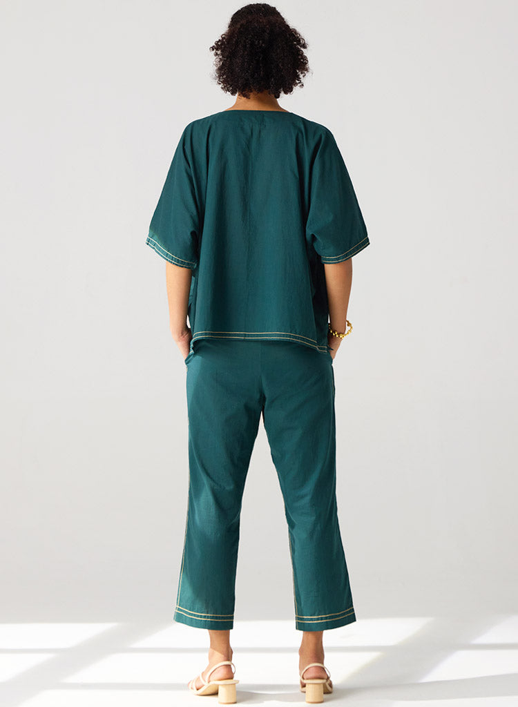 A two-piece set pairing a hand-embroidered top with matching pants. The hand embroidered top with contrast stitches features a V-neck and kimono sleeves. Length 25". The matching pants feature curved insert pockets and half elasticated belt. Length 36". The model is 5'8", and is wearing size S.