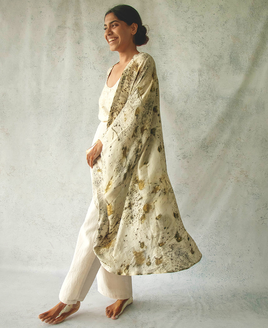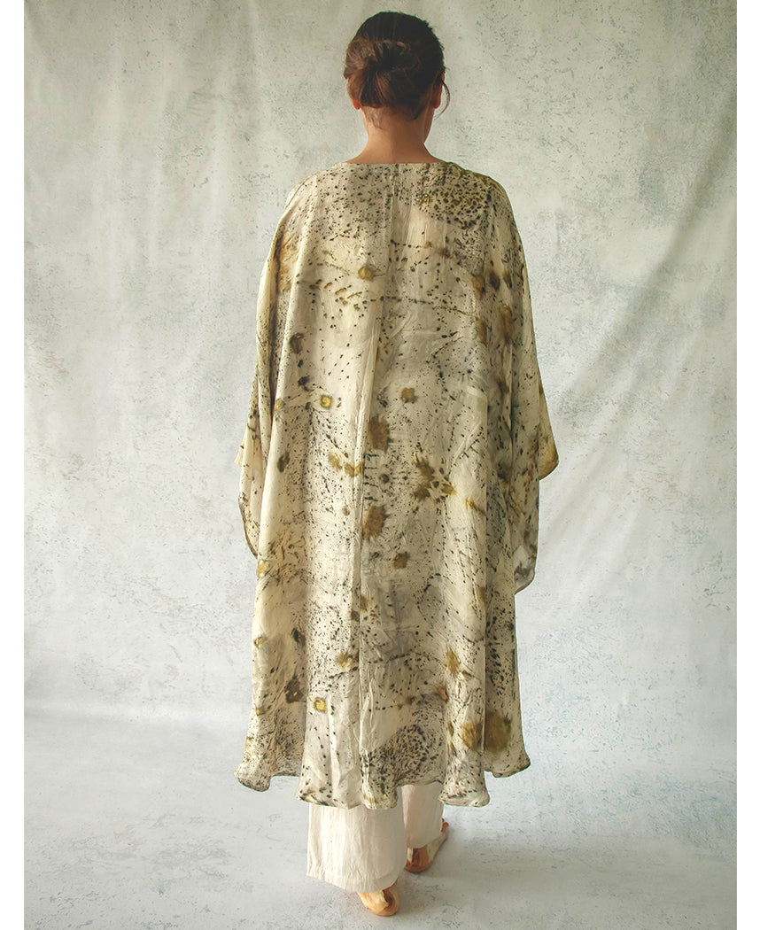 A light open front overlay featuring side slits and kimono sleeves. Front length 28", Back length 43". Comes in a free size and fits XS-2X. The model is 5'3" and is wearing a free size.