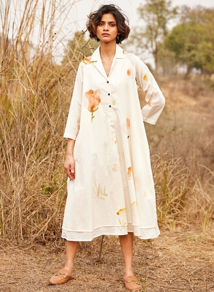 A floral midi dress with front button down detail and a polka dot lining featuring 3/4th raglan sleeve, camp collar with deep V-neckline and side pockets. Length 45.5". The model is 5'6" and is wearing size S.