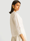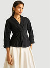 A solid top with a front twist featuring a V-neck with a hook eye and cuffed sleeves. The model is 5'9" and is wearing a size XS.