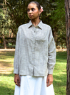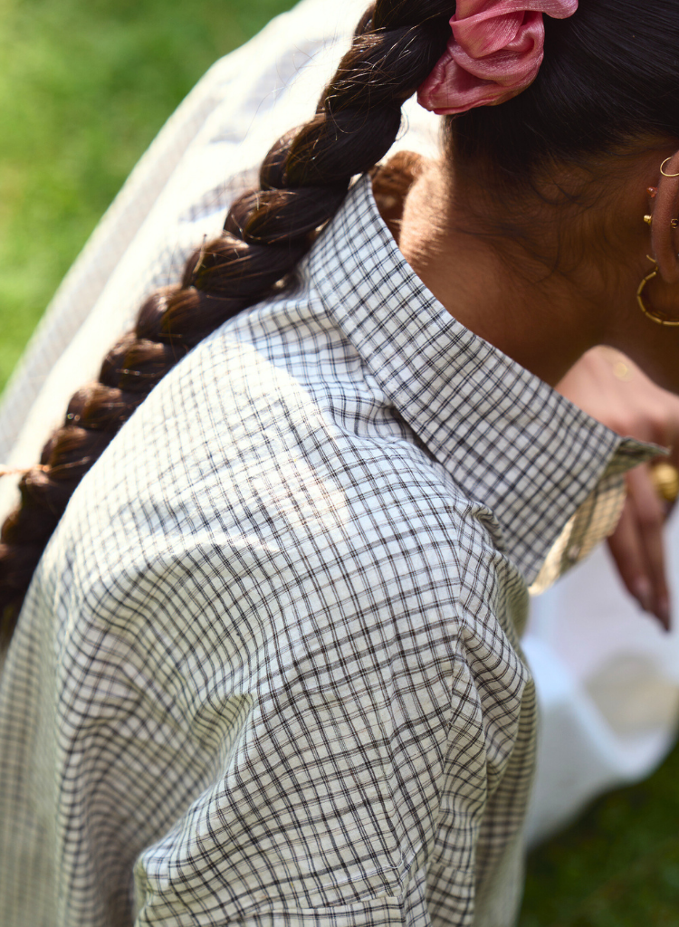 A checkered shirt with a front button-down placket featuring long cuffed sleeves and a classic collar. The model is 5'9" and is wearing a size S.