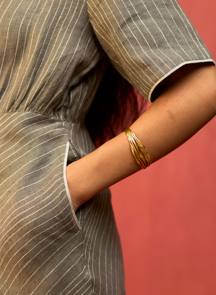 The Fumi is a fit-and-flare dress, cut on the bias with a shaped waist, it drapes beautifully to enhance the silhouette. Intricate contrast woven selvedge piping details are added along the sleeves and pockets. Thoughtfully designed with a side zipper, elbow-length sleeves and deep pockets for ease and wearability. The model is 5'7" and is wearing a size S.