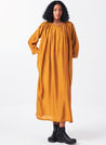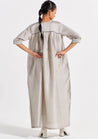 A relaxed-fitting midi dress with gathered neck and back yoke with small front placket featuring a round neck and side seam pockets.
