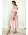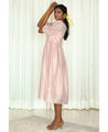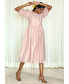 A romantic gathered dress with puffed sleeves and a subtle self-stripe pattern. Features a round neck and back buttons. Comes with a crepe slip. Length 48". The model is 5'10" and is wearing size S.