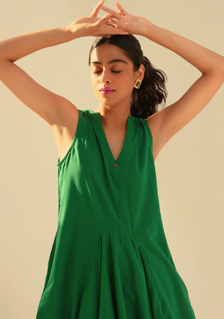 A sleeveless dress with side cowl detailing. Features a V-neck with embroidery detail and inseam pockets. Length 50". The model is 5'7.5" and is wearing a size S.