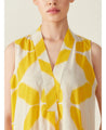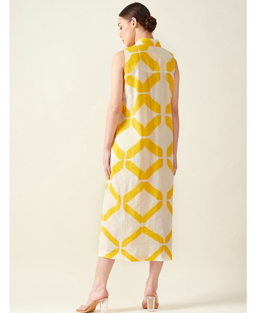 A relaxed fitting midi dress with clamp-dyed geometric print featuring a V-neck and inseam pockets. Length 46". The model is 5'7.5" and is wearing a size S. Made in 100% cotton cambric.