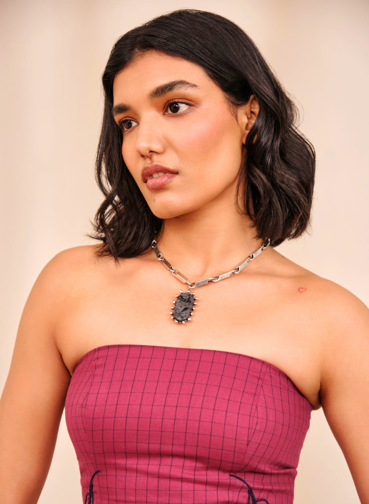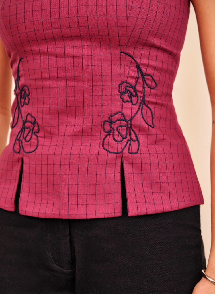 A panelled bodice top with back and front cording embroidery detail featuring a front slit and back zip closure. Length 22.5" . The model is 5'8" and is wearing size S.