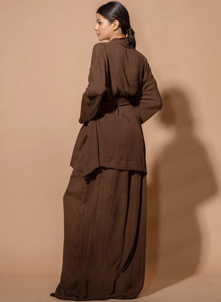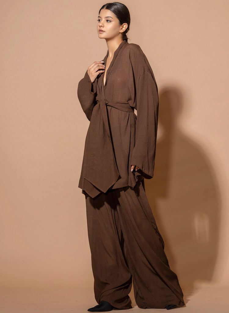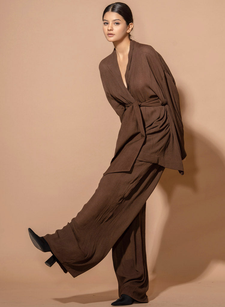 An oversized jacket with an overlapping front and belt fastening featuring a V-neckline and long sleeves. The model is 5'6" and is wearing size S.