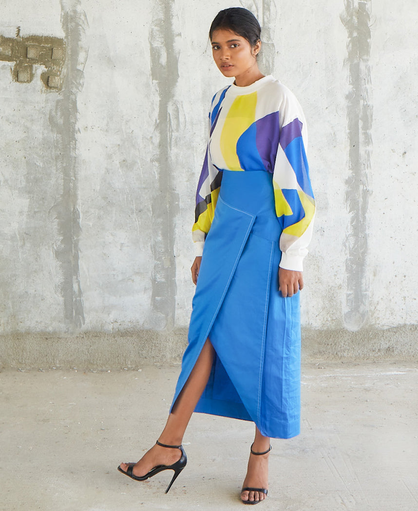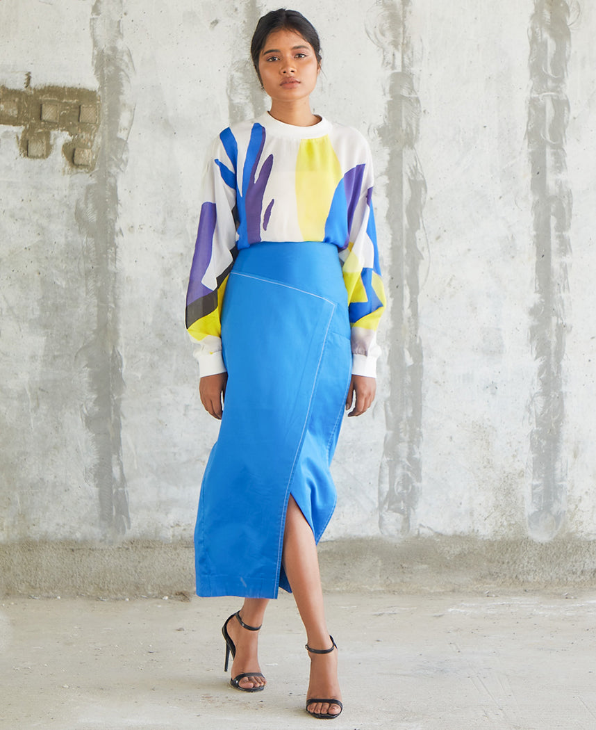 A two-piece set pairing the Glass Sweatshirt and Drape Pencil Skirt. The sporty top features a vibrant abstract print and a ribbed neck and cuffs. Length 23". Made in Chanderi silk. The asymmetrically draped skirt features a flap detail, contrast stitches and a concealed zipper. Length 34". Made in Giza cotton satin. The model is 5'5" and is wearing size S.